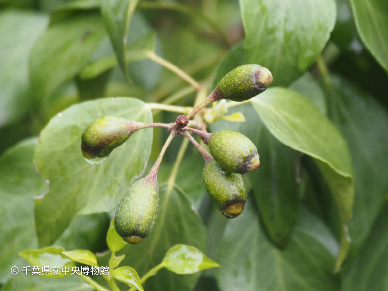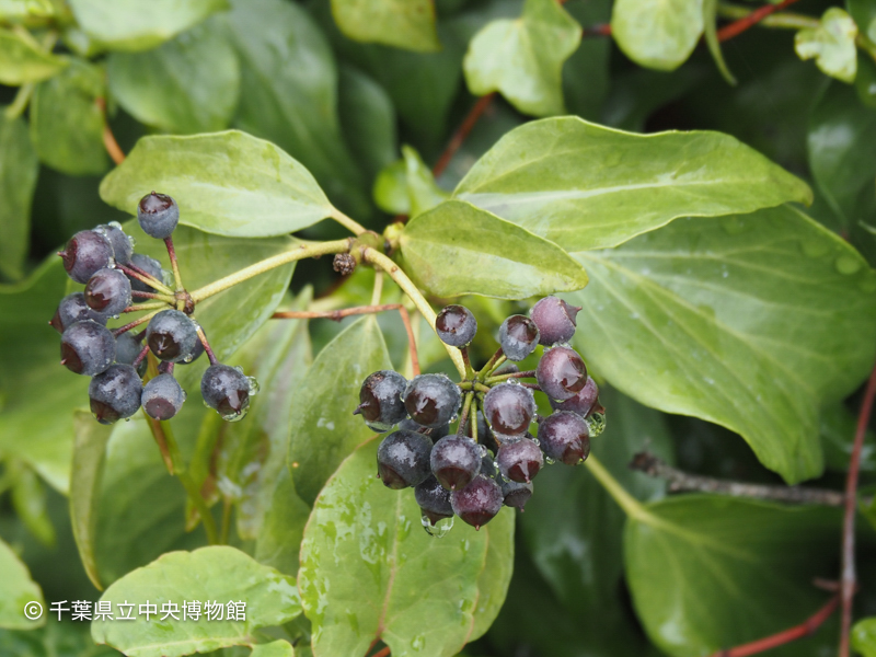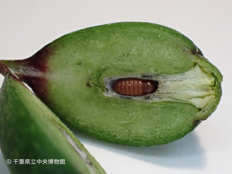 キヅタの果実が黒く熟してきました。同じキヅタのつるに色も形も違う果実がついています。緑色で俵型の果実です。これはキヅタの花のつぼみにキヅタツボミタマバエが産卵してできた虫こぶで、キヅタツボミフクレフシといいます。このハエの幼虫は虫こぶの内部を食べて成長します。虫こぶを切ってみたところ、中には蛹が1個ありました。