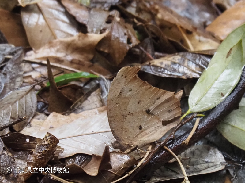 一覧にもどるスダジイ林内をクロコノマチョウの越冬成虫が飛んでいました。なかなか静止してくれないチョウですが、落ち葉に止まったところを撮影しました。翅の色が保護色になっていることがよくわかります。