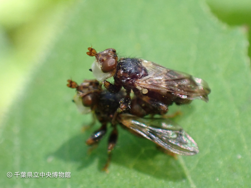マダケ林で見つけました。マダラメバエのペアです。マスクを付けているような白い顔が特徴です。幼虫はハナバチ類やスズメバチ類に寄生します。