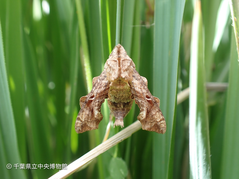 ススキ草地でススキの根元近くにとまっていました。スズメガ科の中では小型です。越冬した成虫だと思われます。幼虫はヘクソカズラを食べます。