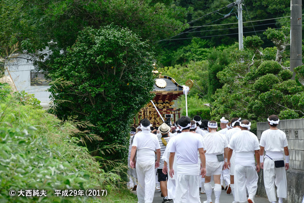- 相浜へのお浜出は、子供たちが白木の神輿を、青年団が塗りの神輿を担ぎ、鳥毛やかっこ舞なども加わる賑やかな行列でした。「岡」と「浜」の交流で豊作・豊漁がもたらされると考えられていました。