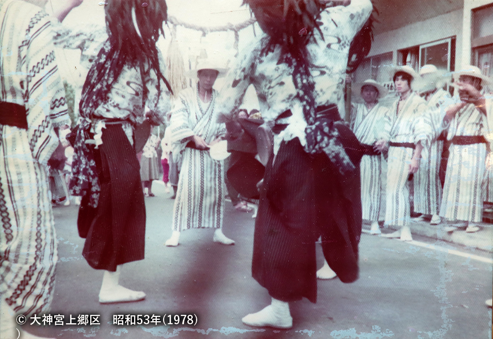 - 大神宮は5区に分かれ、かっこ舞は上郷(かみごう)区の役割でした。お浜出が行われなくなった後も神輿出御の前に、区内各所で奉納していました。