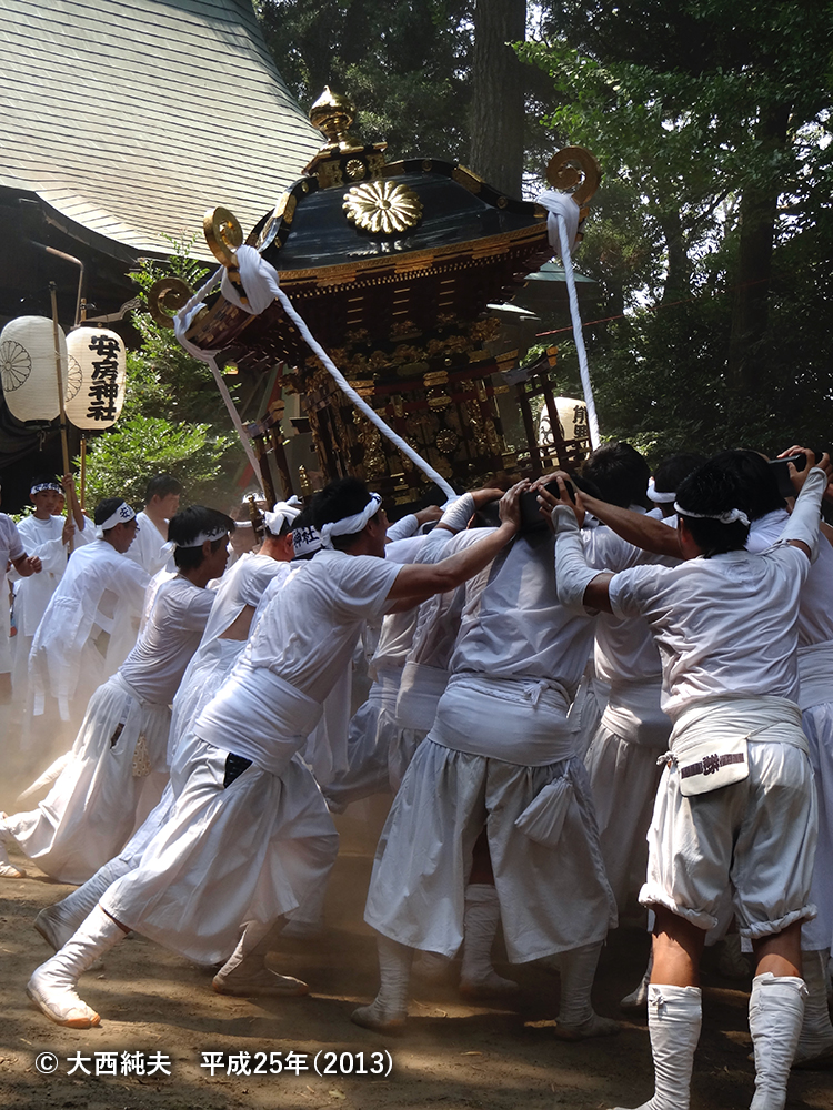 8月9日に子供神輿、10日に青年団の神輿の渡御が行われます。白丁姿の青年団が出御祭の後、地域へ繰り出していきます。現在は安房神社一社で行っていますが、昭和32、3年頃までは9日に近隣9社の神輿が集まり、また10日には相浜(あいはま)でお浜出神事が行われていました。