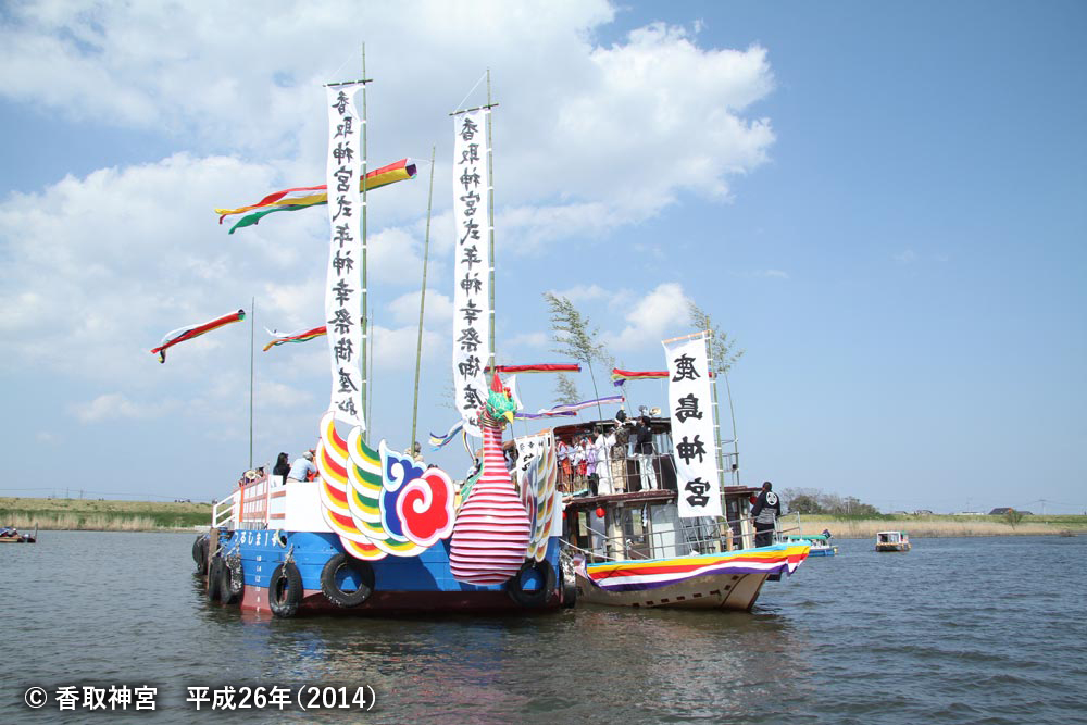 - 津宮(つのみや)で御座船(ござぶね)に乗り、牛ヶ鼻沖で鹿島神の出迎えを受けます。同年9月に行われる鹿島神宮の神幸祭は龍頭(りゅうとう)船を用い、香取の鷁首(げきしゅ)船と一対になっています。