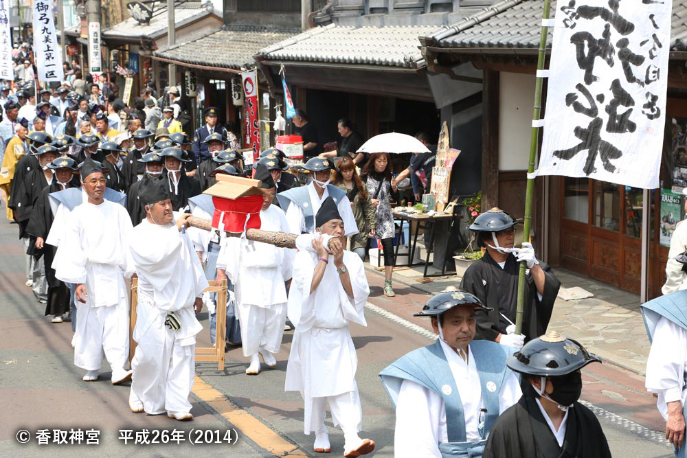 - 香取神は津宮から上陸して亀甲山(かめがせやま)に鎮座したとの伝承があり、上陸地に神の船を象徴する御船木(みふなぎ)を納めるのが、神幸祭の本来の目的です。御船木を津宮に納めて還御となる小規模な神幸祭は、毎年行われています。
