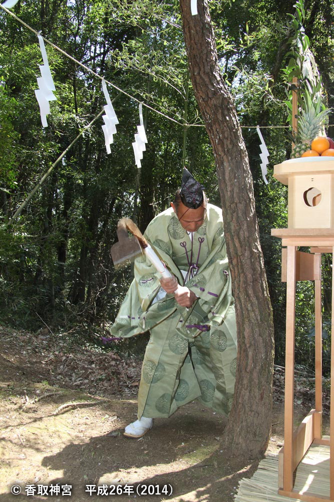 - 御船木山(みふなぎやま)と呼ばれる神宮の山から、工匠長の手で松を伐り出す山口祭が、毎年4月11日に行われています。
