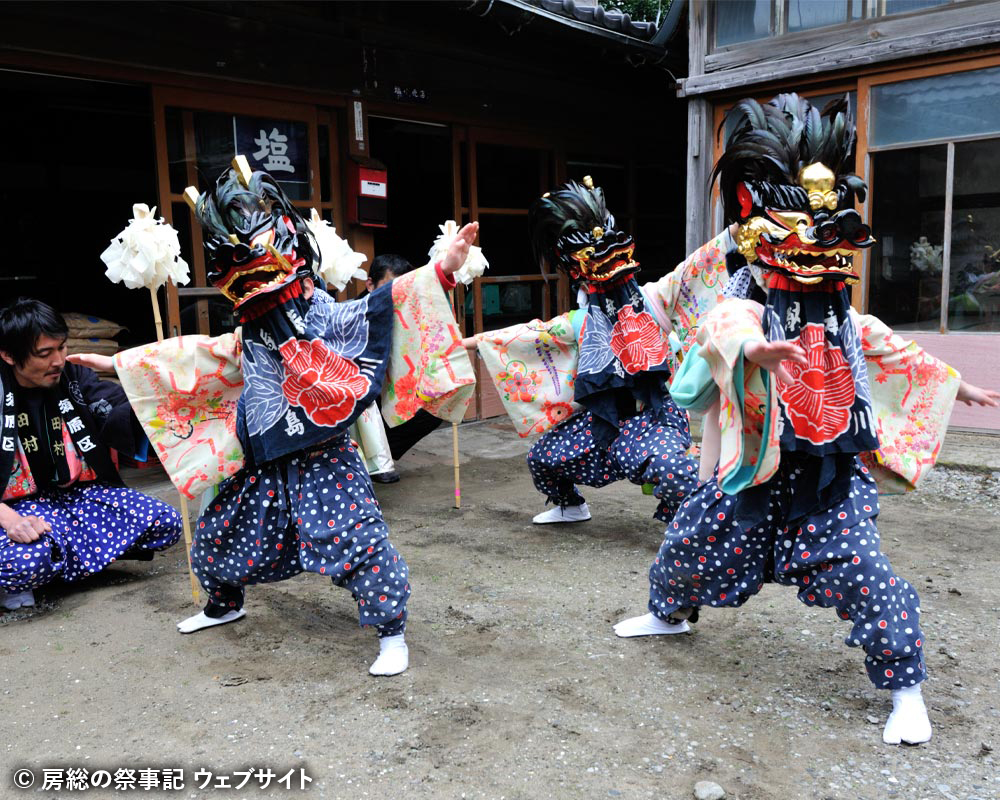 - 腹に太鼓を付けず、手で膝を叩きながら舞います。1軒1軒の玄関や庭先で、オンベンと呼ばれる幣束を前にして舞い、舞い終わると家人の頭を噛んで悪魔祓いをします。