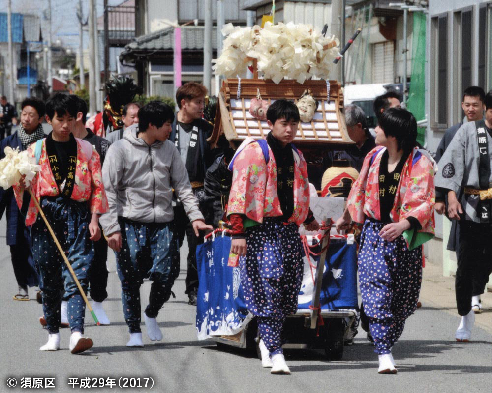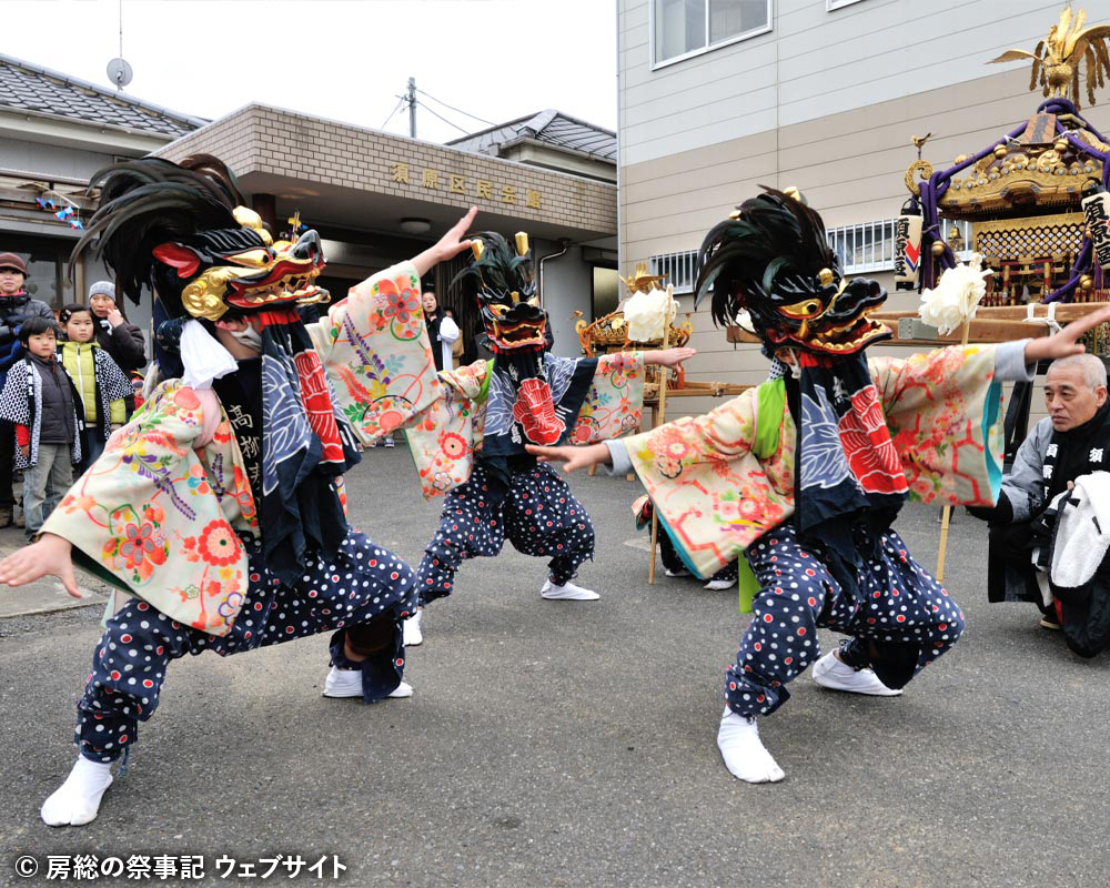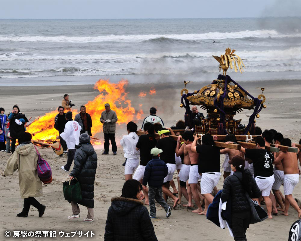 九十九里町の片貝(かたかい)や粟生(あお)では、早春の海にお浜降りをします。片貝では産土(うぶすな)様の第六天(皇産霊(こうさんれい)神社)で2月11日に行われる「関万歳(せきまんざい)」を皮切りに、片貝三村の須原(すはら)、屋形(やかた)、西の下で、それぞれ悪魔祓いと浜大漁を祈願する祭りが行われ、海に神輿が入ります。