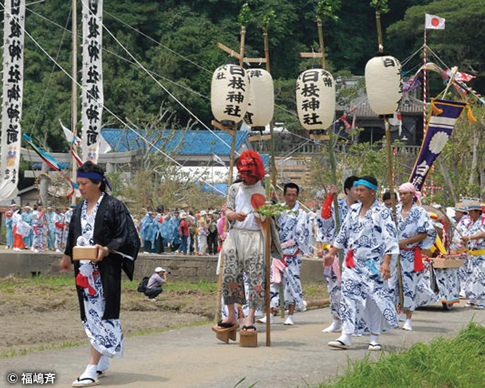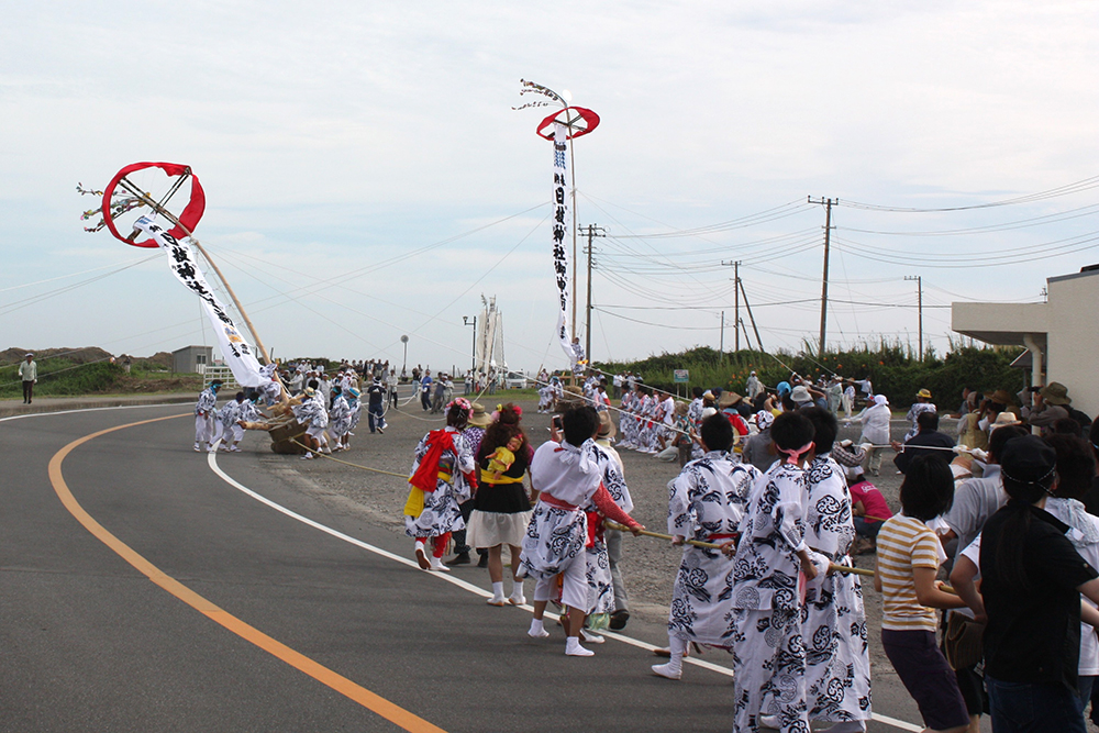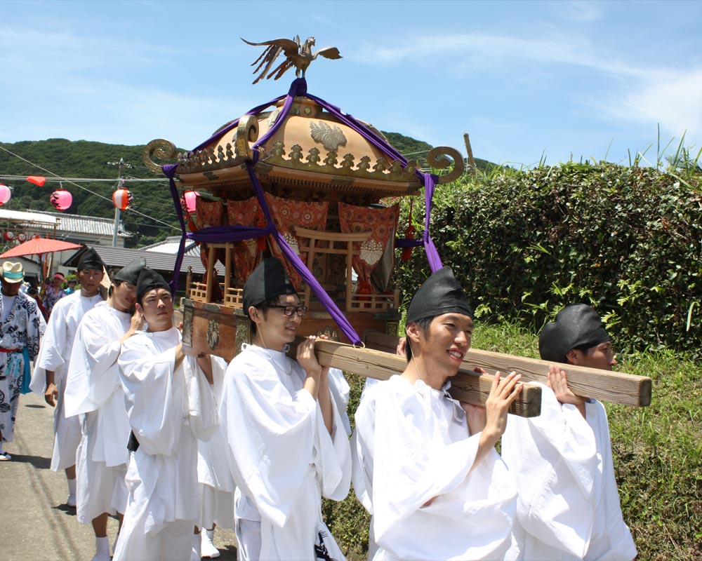 4年に一度、ヨイマチ、ホンマチ、アトマチと3日間にわたって、村をあげて行われる祭りです。日枝神社の神輿が海に向かうお浜出と、日天(にってん)・月天(がってん)を象った1対の大幟を曳くオオナワタシが中心的な行事で、ササラ踊り、トヒイライ・エンヤボウ・酒樽万燈などの芸能が祭りを華やかに彩ります。