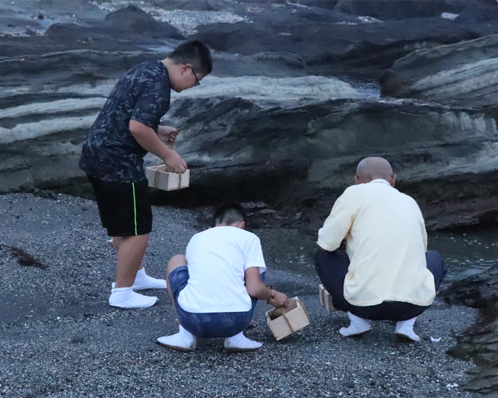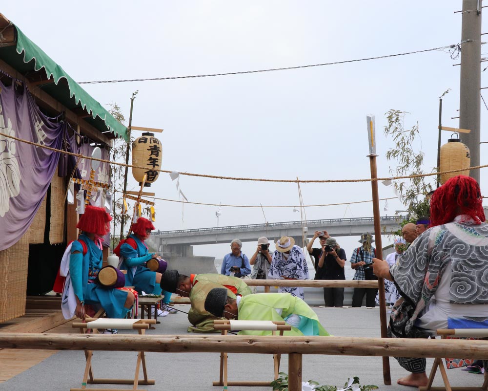 - ナカダチに選ばれると、祭礼の50日前から早朝の海岸で潮に洗われた砂を取り、日枝神社の拝殿に供えます。かつては祖母が作る食べ物しか口にできないなど、厳しい精進潔斎も課せられていました。