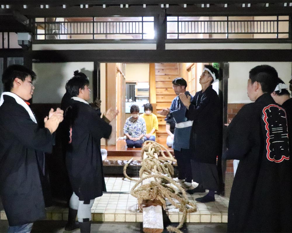 青年たちがオダチを担いで1軒1軒回ります。まず玄関口にオダチを入れます。「タチを付ける」といい、頭を先につけ、次に尻を降ろすのが作法です。