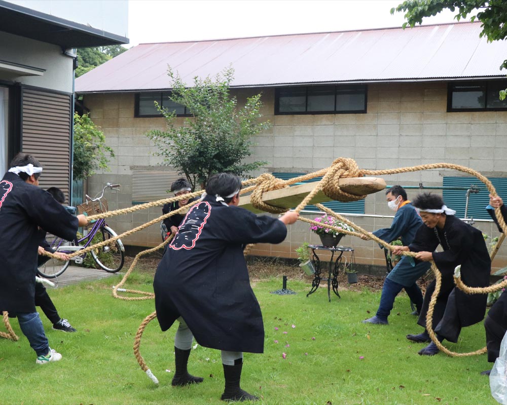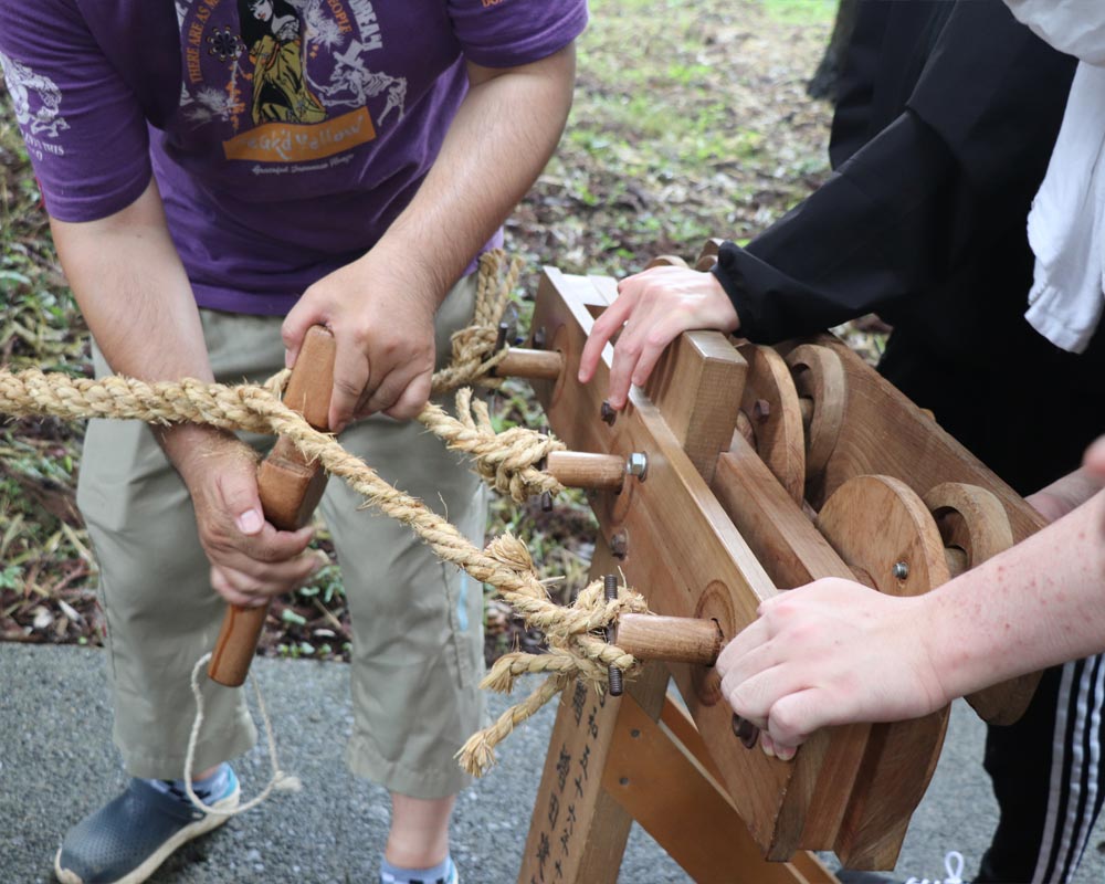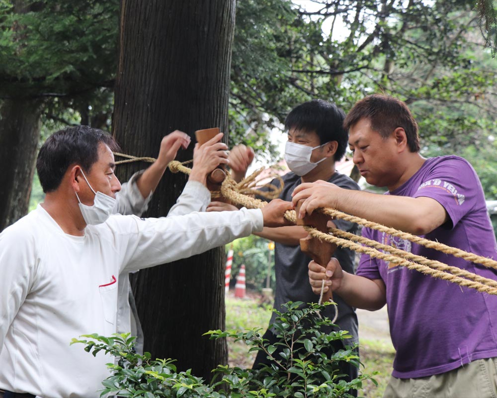 - 祭礼当日の午前中に、市販のわら縄を使って太縄を綯(な)います。太縄を綯う機械は地元の工務店が作ったものです。できあがった太縄は注連縄としてオダチに巻き付けます。
