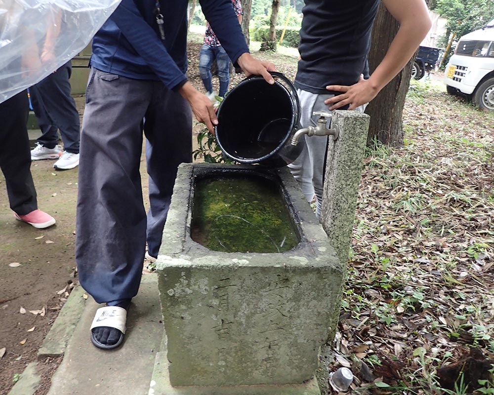 火皇子神社を出発する前に、川から小魚を捕ってくると、神社の手水鉢に放します。 -