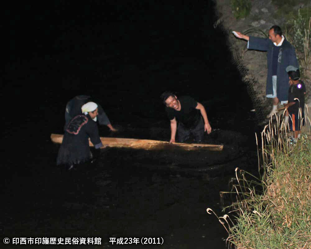 オダチの縄を鉈で断ち切り、縄をたわし代わりに、川の水で洗います。火皇子神社にオダチを戻して古新田の天王様は終わります。 -