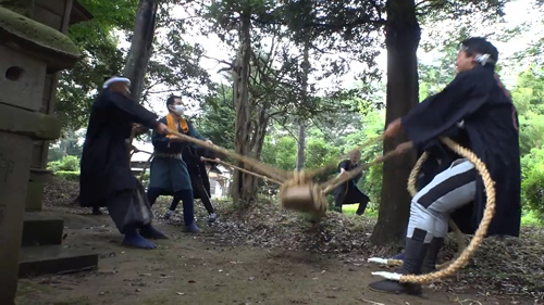 その後、掛け声とともに門口や庭で、三回地面に叩きつけます。この時はオダチの頭を南に向けます。 -
