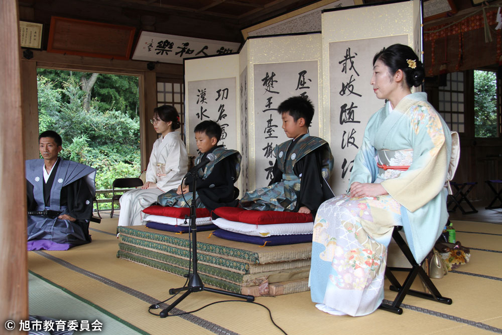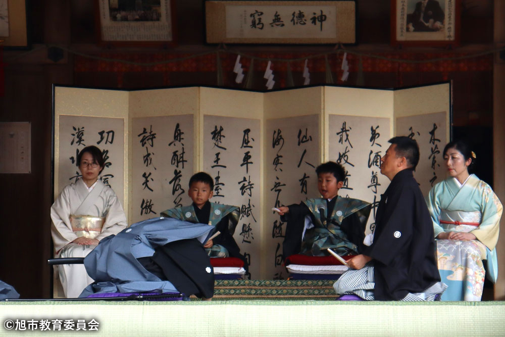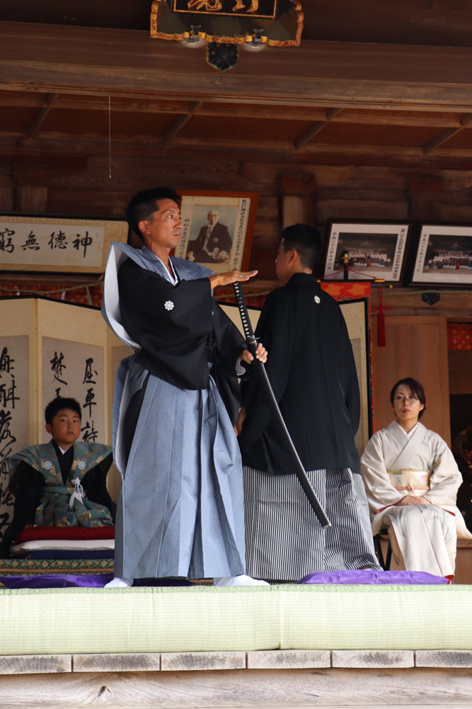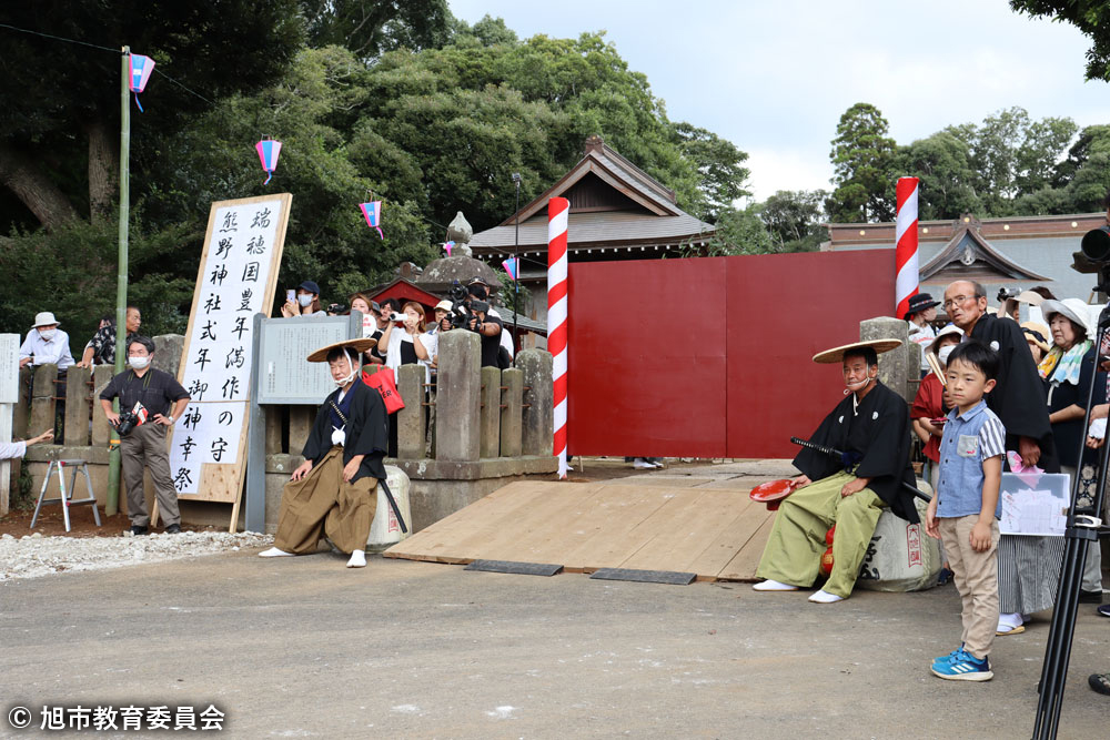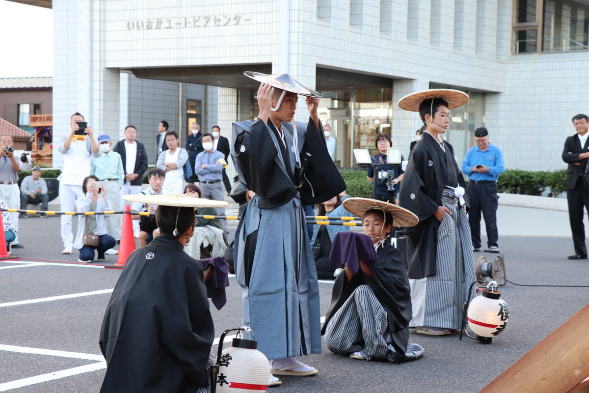 門の外に辻番、内に門番が2名ずつ、拝殿に設えた「殿中」には殿様と使者受が2名ずつ配されました。辻番2名は朱塗りのひょうたん徳利と大きな盃を持ち、酔った素振りで観客を笑わせる道化的な役割です。また門番2名は、左京、右京の家から一人ずつ務めることになっています。 - 殿様は小学校低学年(今回は1年生と2年生)の2名の男児が務めました。殿中への入場の際、地面に足をつけてはいけないといわれ、地域の男性が肩に載せる仕来りがあります。また、ひな壇の殿様の脇には母親が着物姿で座り、母子の晴れ姿が披露されました。