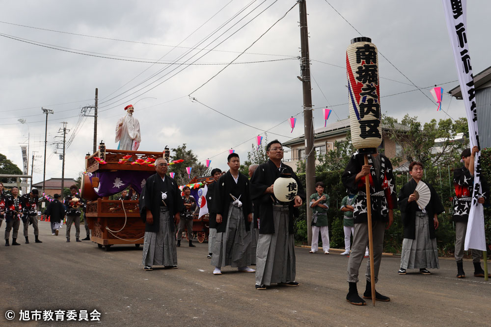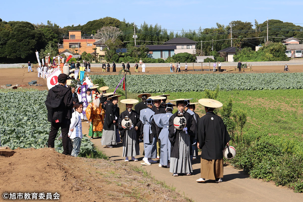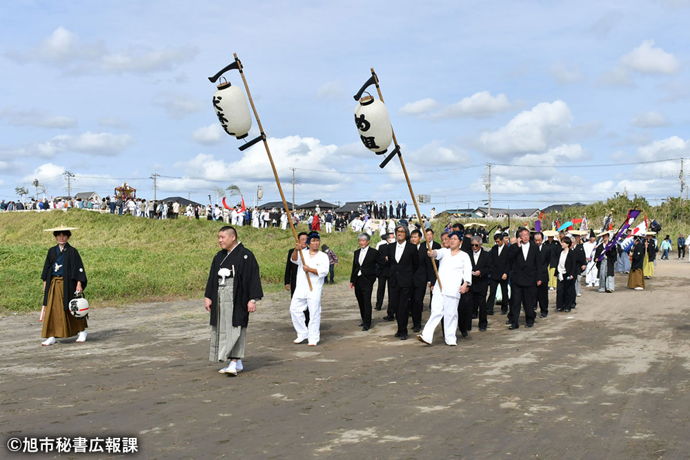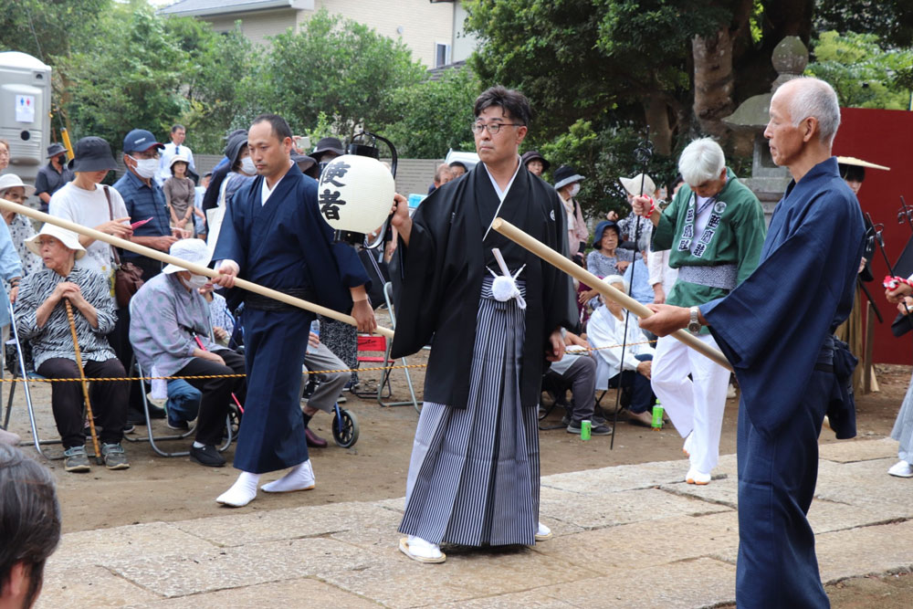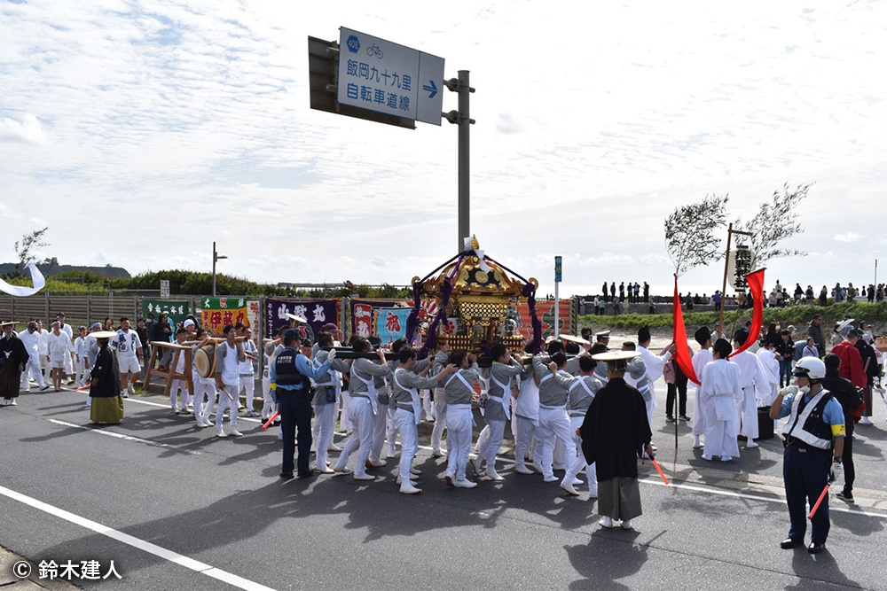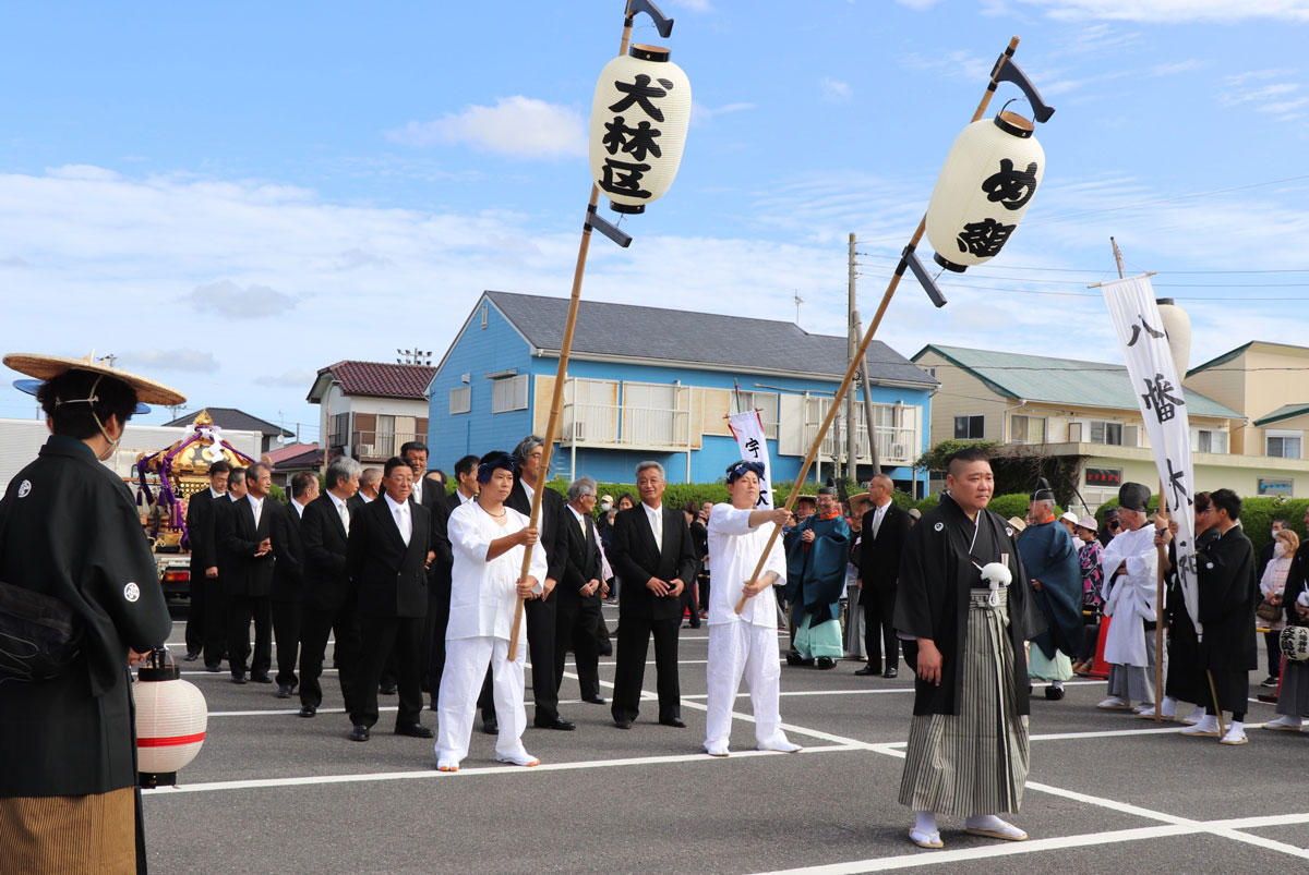 8日は8時45分から発輿祭、続いて召立が行われ、大久保家当主を先頭に、目那区と犬林区の高張提灯、三川7区の区役員、三川区出身の旭市議会議員、矢刺神社宮司と続き、そのあとに松澤熊野神社の神幸行列が続く形で、三川浜の渡海祭の祭場まで歩いて渡御を行いました。
