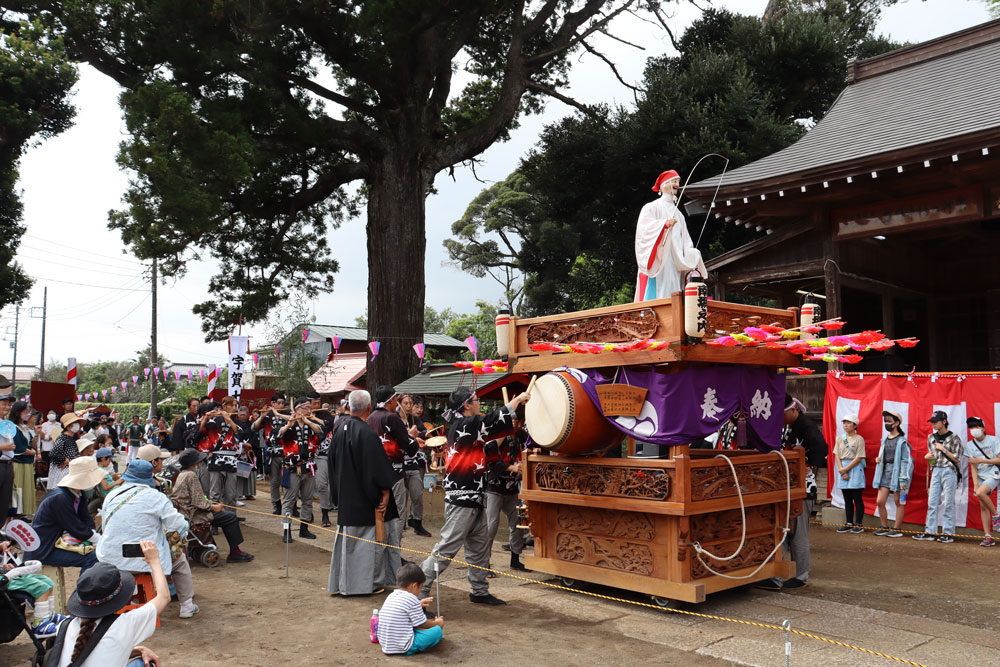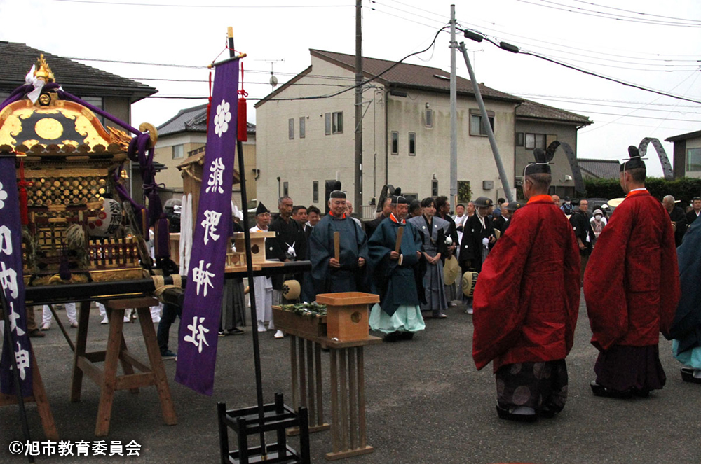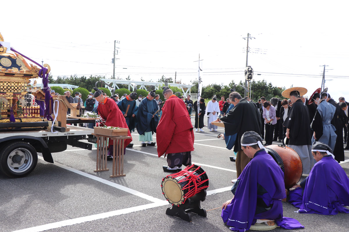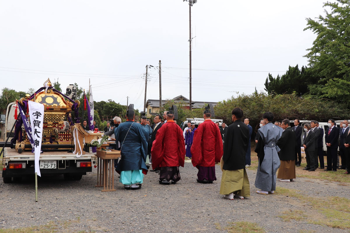 網戸農村協同館、江ヶ崎コミュニティセンター、琴田新町境(道路脇)、新町の石嶋家、諸徳持のJAちばみどりひかた支店駐車場の5ヶ所で駐輦祭が行われ、各地区役員等の参拝を受け、宮司から太玉串が授与されました。特に新町の石嶋家と加瀬家は、長く休憩場所を提供し、丁寧なおもてなしがあった家です。石嶋家で行われた祭典で、宮司から2家の当主へ、太玉串の授与が行われました。