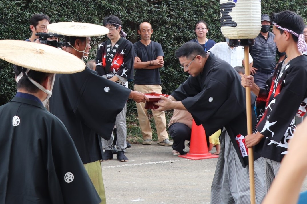 使者一行は、本陣前を通過し、その後を神幸行列が入場します。本陣の前に神輿を安置すると正式参拝が行われました。参列、参拝者は大久保家当主、三川地区実行委員会を構成した三川地区出身の旭市議会議員と三川7区の役員であり、7区それぞれに宮司から太玉串が授与されました。