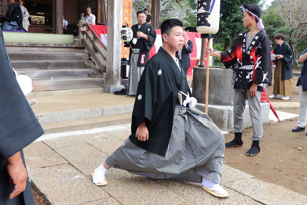 諸徳持は、使者付、使者の順に並び、その周りを4人の金棒付きが囲む形で門前に立ちました。 口上や行列の人員、門から拝殿までの歩き方まで、南堀之内とは若干異なり、諸徳持の使者付と使者は、門から拝殿まで終始、右足と右半身、左足と左半身が一緒に前に出る歩き方で進みました。 - ③下座