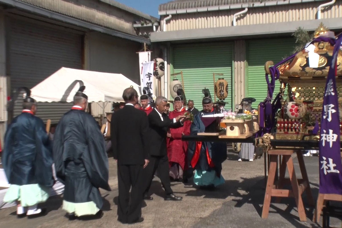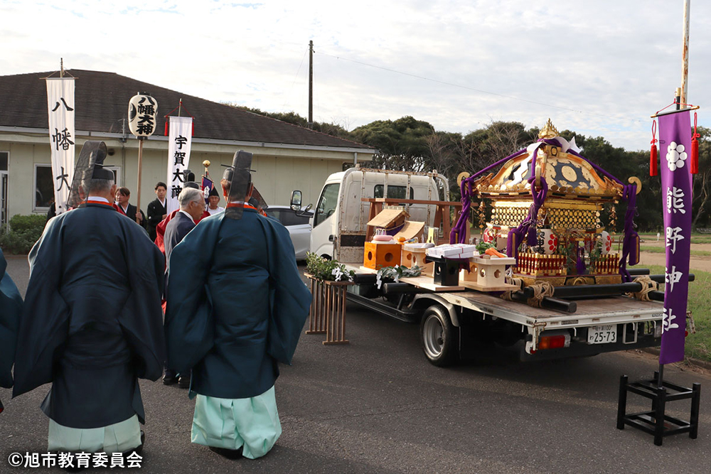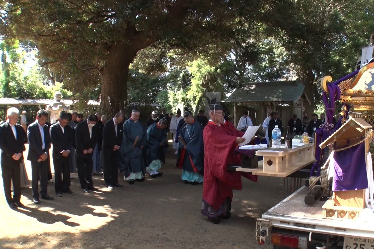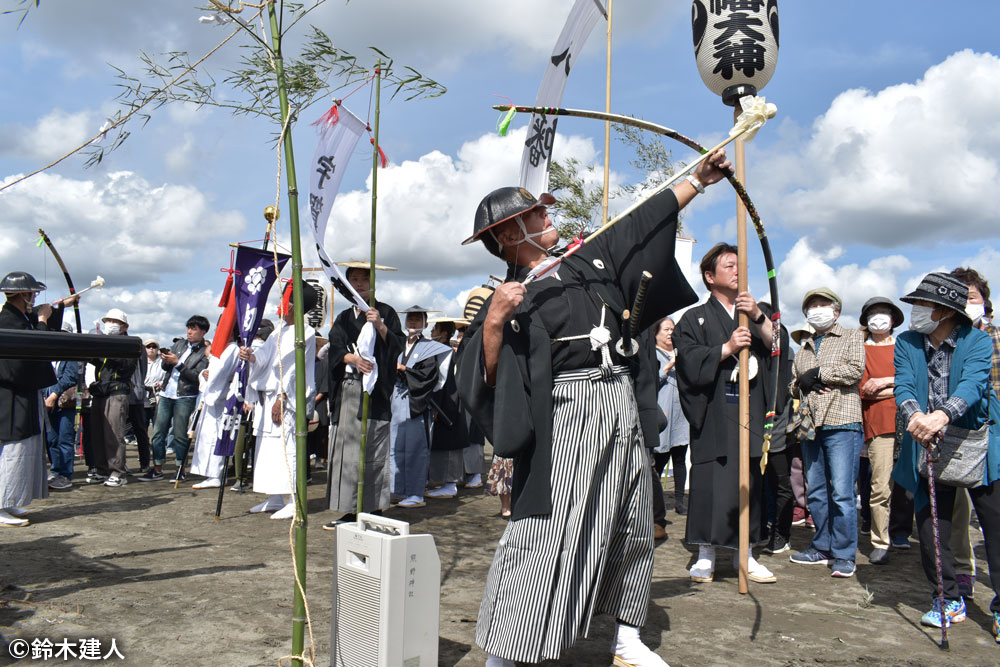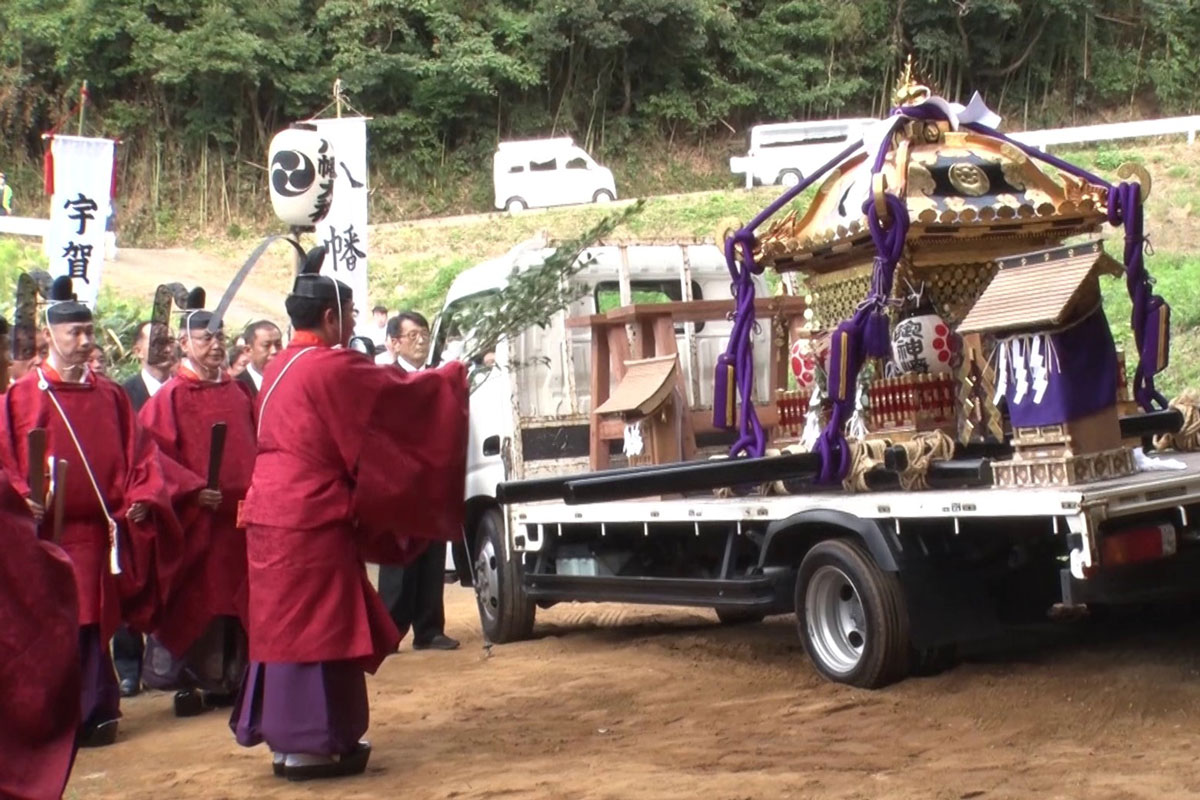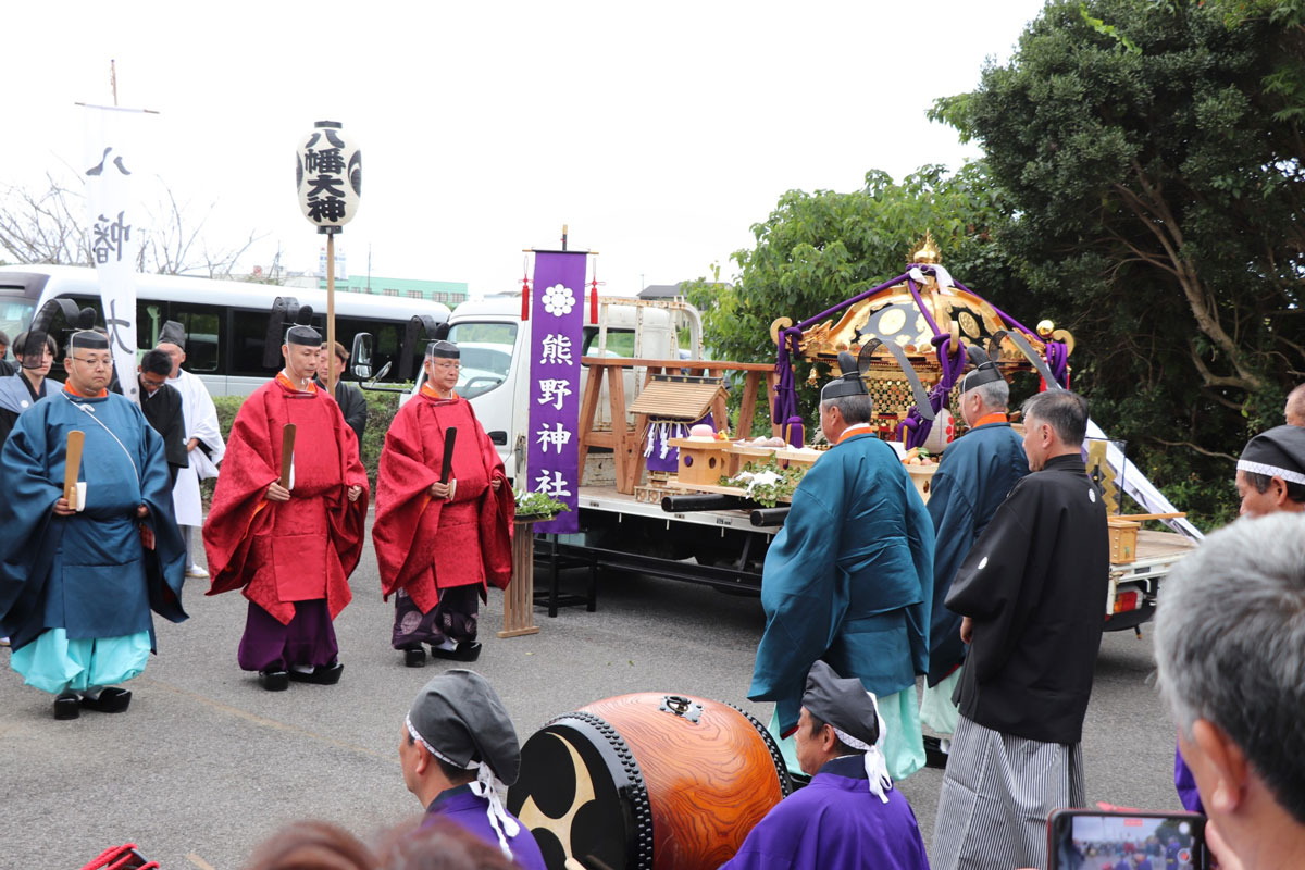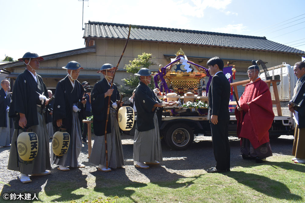 - 三川下宿区の熊野堆の石宮前にウマを置いて神輿を安置し、矢刺神社の往古宮司が祭主を務めて奉迎祭が行われました。熊野堆を管理する大久保家ほか、下宿区の役員や矢刺神社の役員が参列、参拝し、大久保家当主に宮司から太玉串が、続いて四天王から御神矢が2本贈られました。
