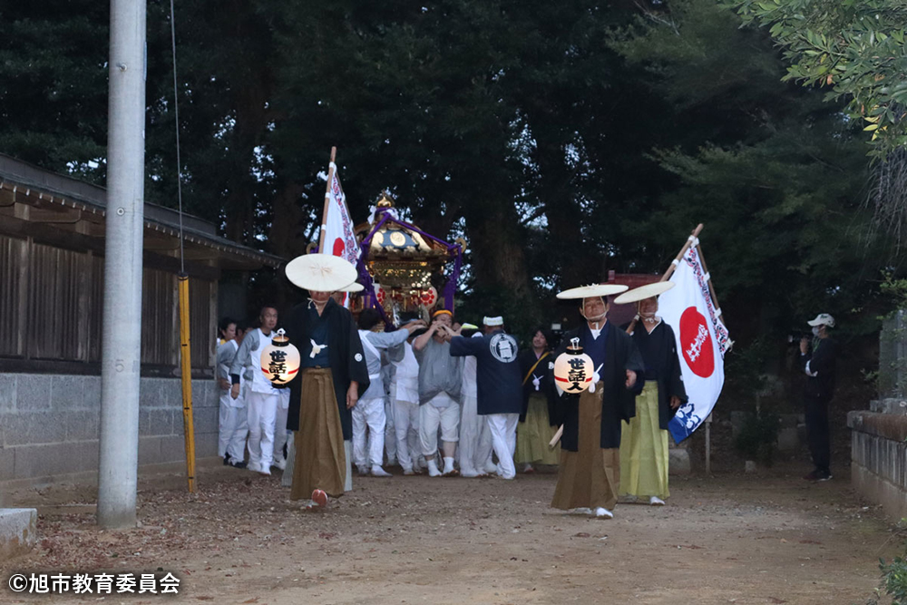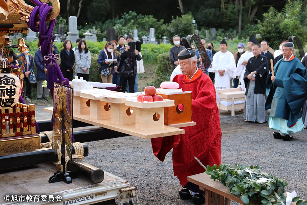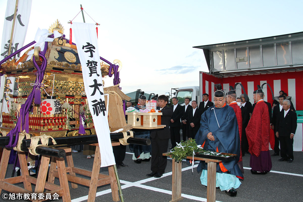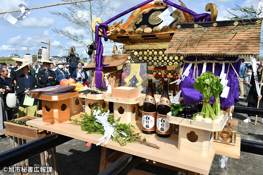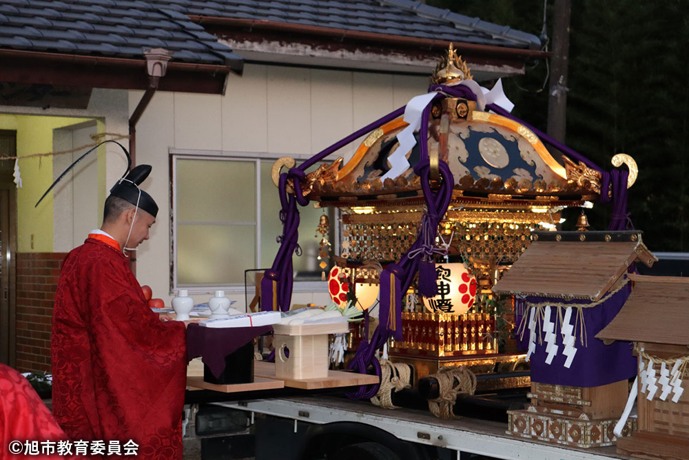 「戸板祭」の名のいわれは、急遽、ここで祭典を行うことになったので、社殿の扉(戸板)で祭壇を設けたことによると伝えられています。神饌を三宝にのせず戸板にそのまま並べるのが、ここでの祭りのやり方だったですが、令和5年は他祭場同様、車載されたままの神輿の担ぎ棒の上に板を渡し、三宝に載せた神饌を並べる形で行われました。 -