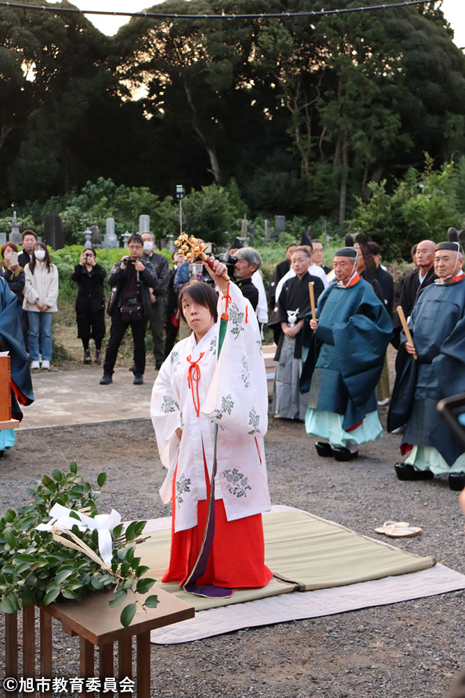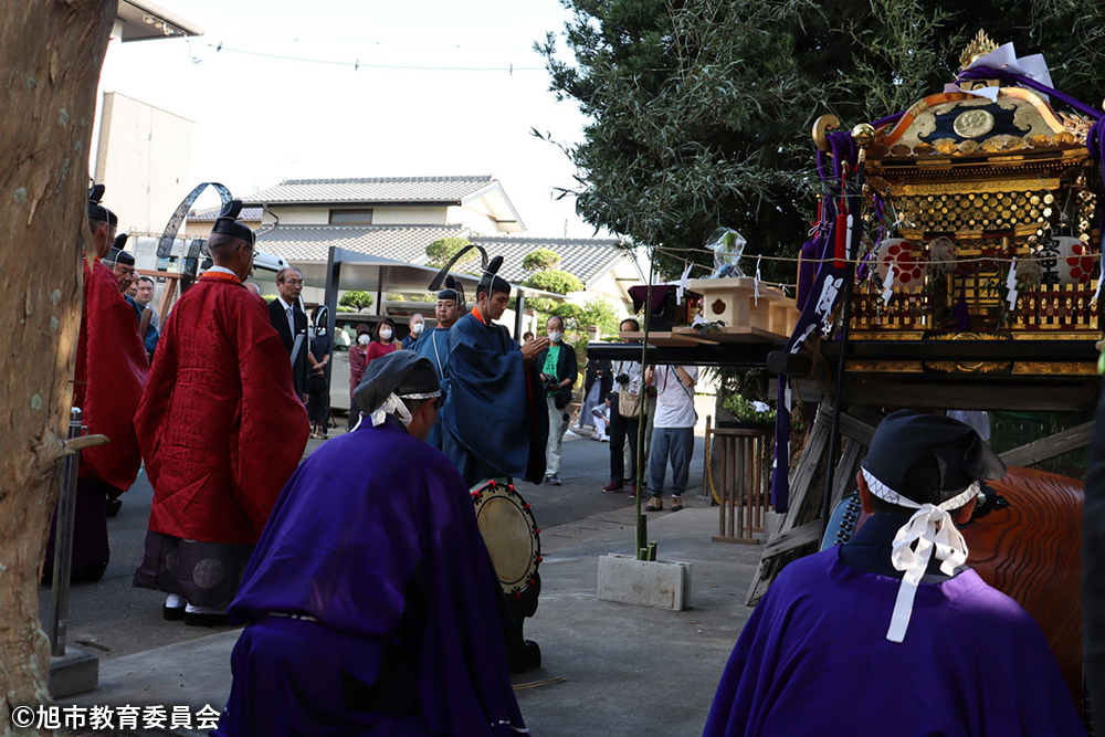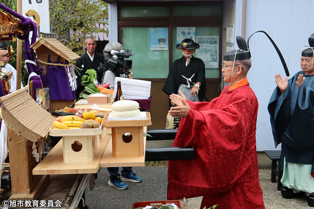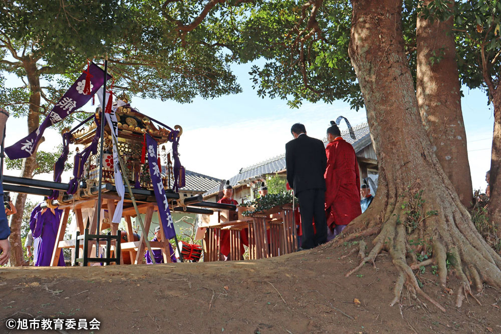 - 平山家の氏神前の祭場で、土壇上に神輿を移動し「七五三掛竹祭」が行われました。蛇園区の役員、稲生神社役員の参列、参拝がありました。最後に平山家当主へ、宮司から太玉串が、続いて四天王から御神矢が2本贈られました。