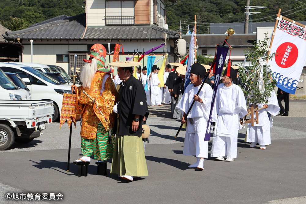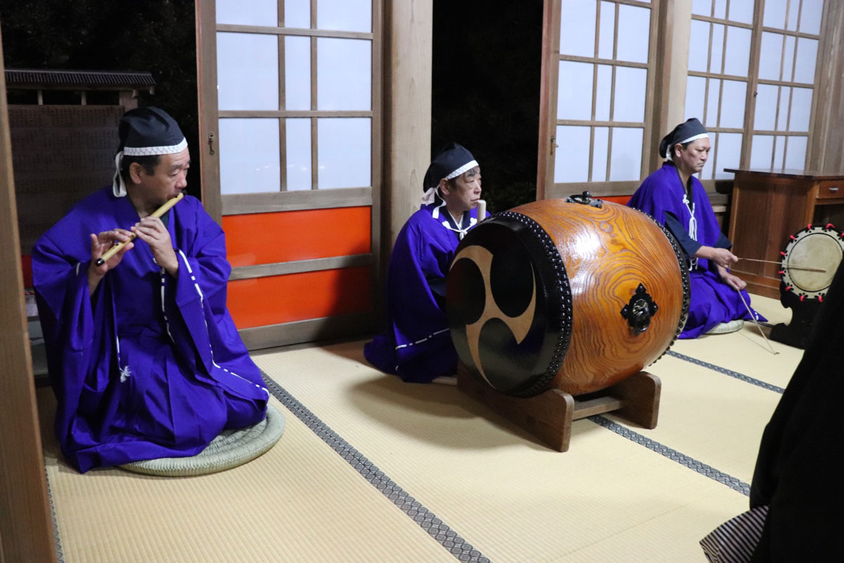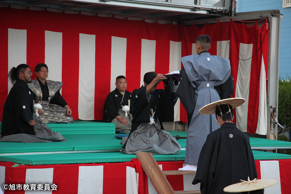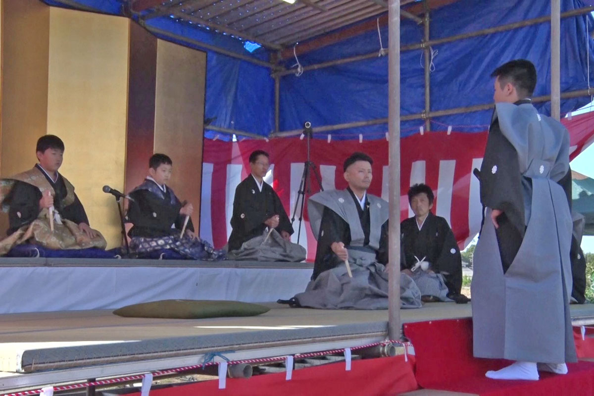- 諸徳持区の使者が殿様に芸能披露の許可を得、下座の演奏を行った。