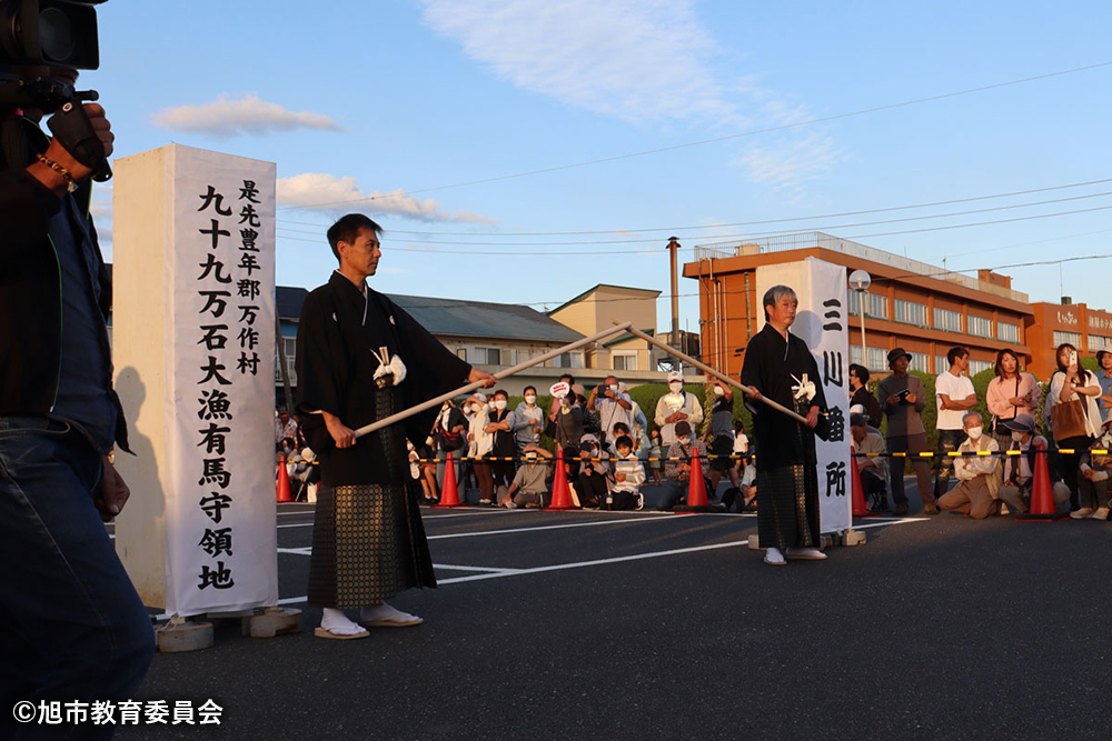 三川番所では、12時50分から関係者一同が本陣前に整列して開所式が行われ、三川地区実行委員会の片桐会長が、開所宣言を行いました。そして地元の和風バンド「椿の海」により、「九十九里大漁木遣り唄」「組曲椿の海」「祈る豊年おはまおり」の3曲が演奏されました。引き続き諸徳持、南堀之内の順で芸能の披露が行われ、神幸行列の入場は16時45分でした。使者付「頼もう、熊野神社の使者、到着に着き、開門頼もう」