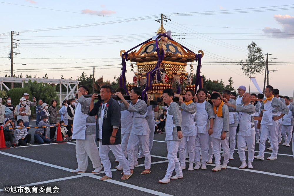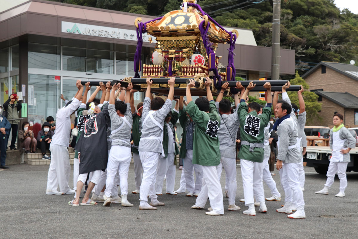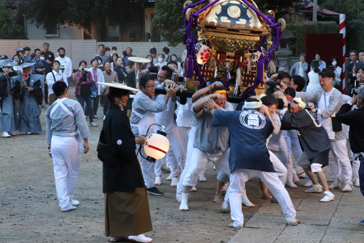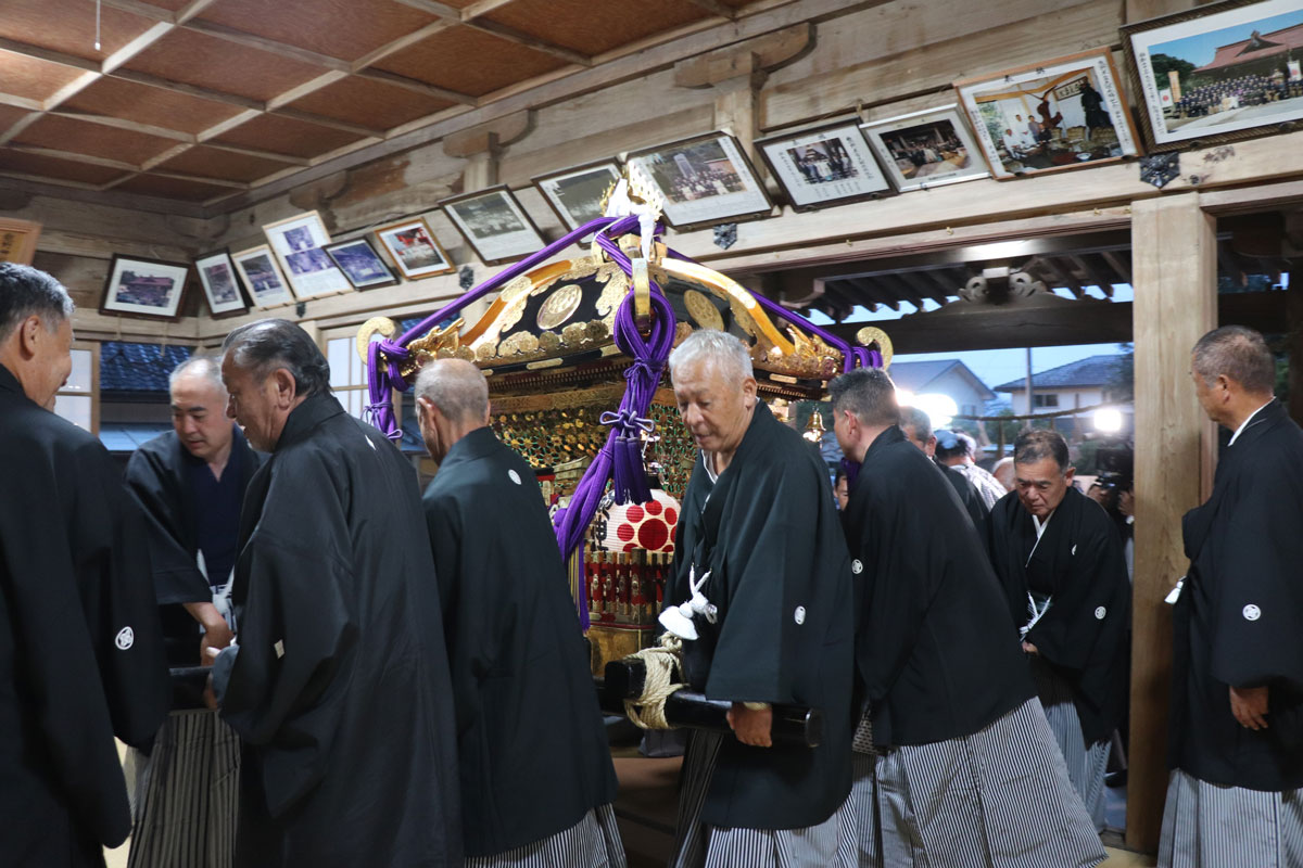 かつてはお浜下りに続いて三川地区を渡御し、我留前(小林)家で神輿の胴に巻いた晒を取り、清水で洗い清めて飾り金具や力綱を元に戻す「更衣祭」が行われ、さらに大久保家まで戻って還御祭が行われました。我留前家で取った晒は、安産の守りとされて希望者に頒けられました。しかし今回は三川浜の祭場で、そのまま還御祭が行われ、その後、神輿は車載でユートピアセンターに運ばれ、水洗いされました。