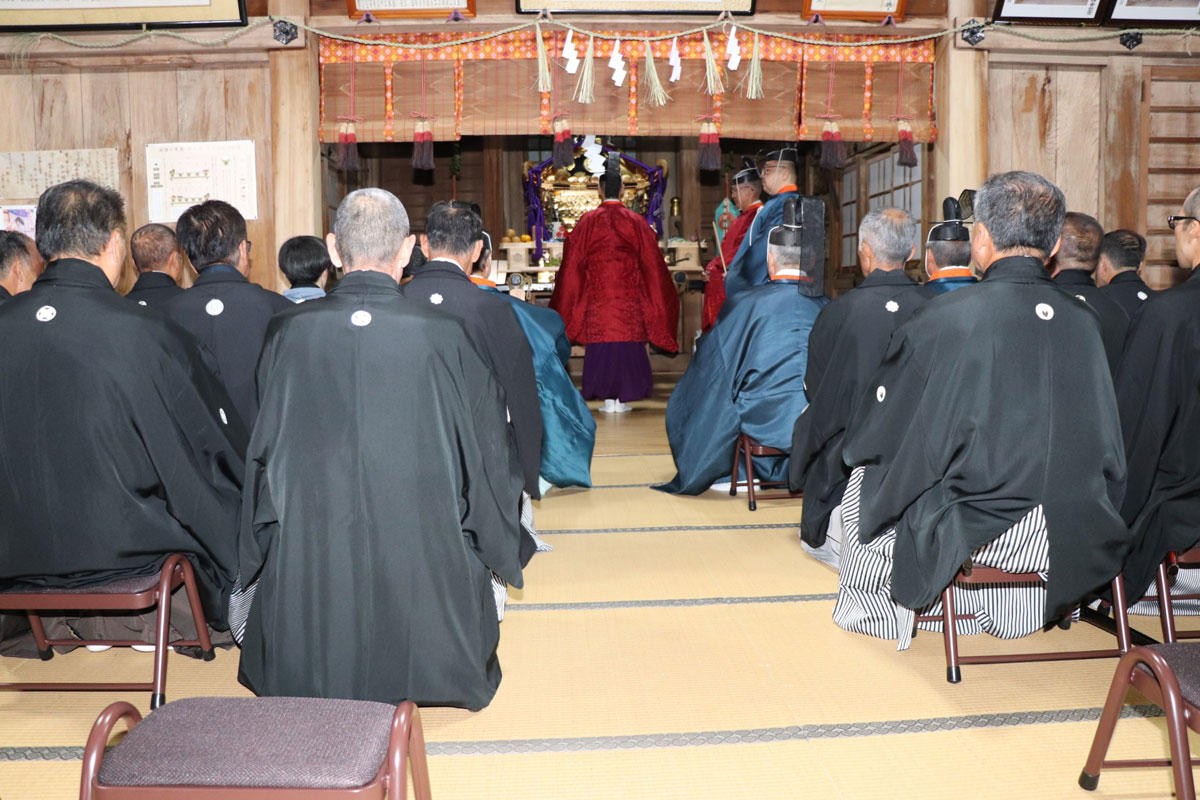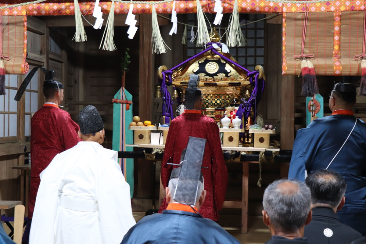 還御祭ではまずご神体が神輿から本殿へ移され(「入御」)、祭典が行われました。そして、拝殿では神社役員、供奉神社関係者、四天王、神輿師などで神職を囲む直会の席が設けられました。