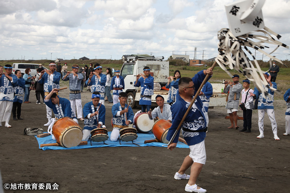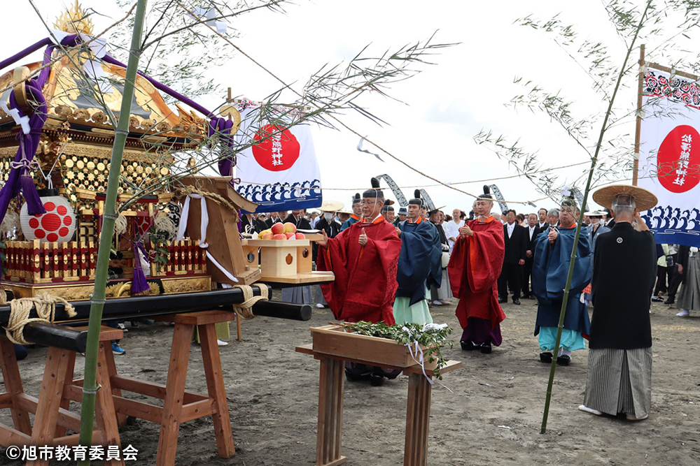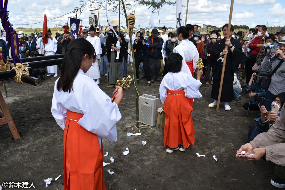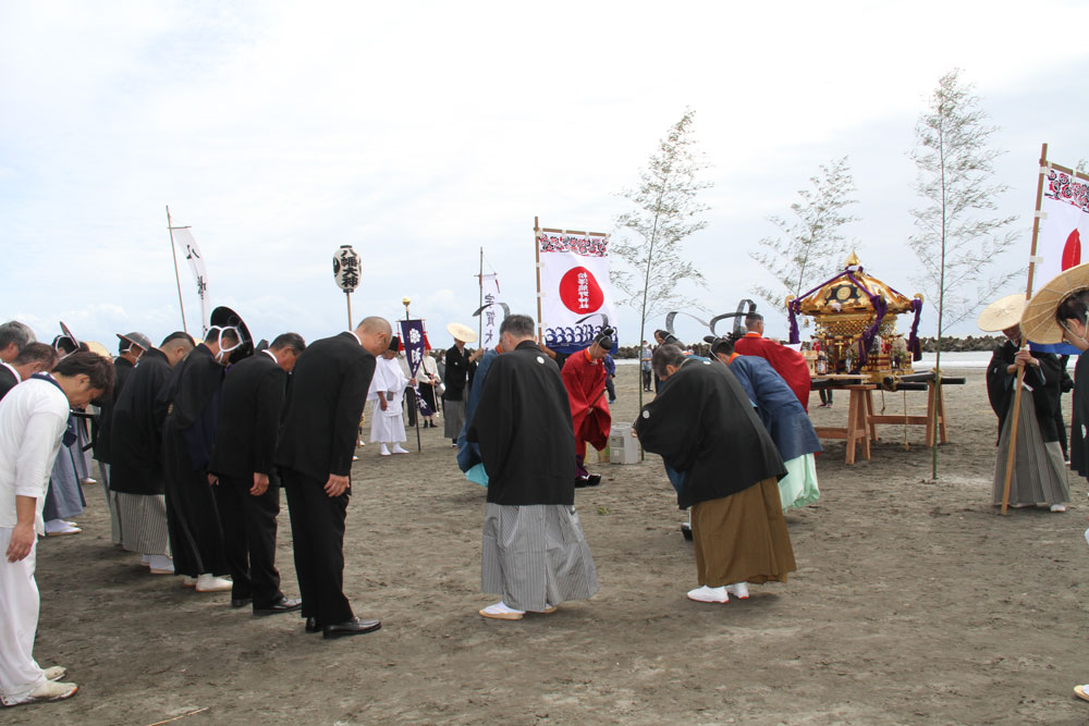 四本の篠竹に注連縄を張って用意された祭場に、神輿を海へ向けて奉安し、渡海祭が行われました。旭市長(大祭委員長)、市議会議長をはじめ、松澤熊野神社側からは左京、右京、神社役員、四天王、区長、三川地区からは実行委員会の議員、区役員が参列し、玉串奉奠を行いました。そして渡海祭の終了と合わせて、長岡区長の発声で四天王による四方祓(よもばらい)が行われました。なお、舟曳場と呼ばれる祭場の場所は、国道から浜に降りる都合や、消波ブロックの配置等により決められたもので、祭礼上の意味はないそうです。