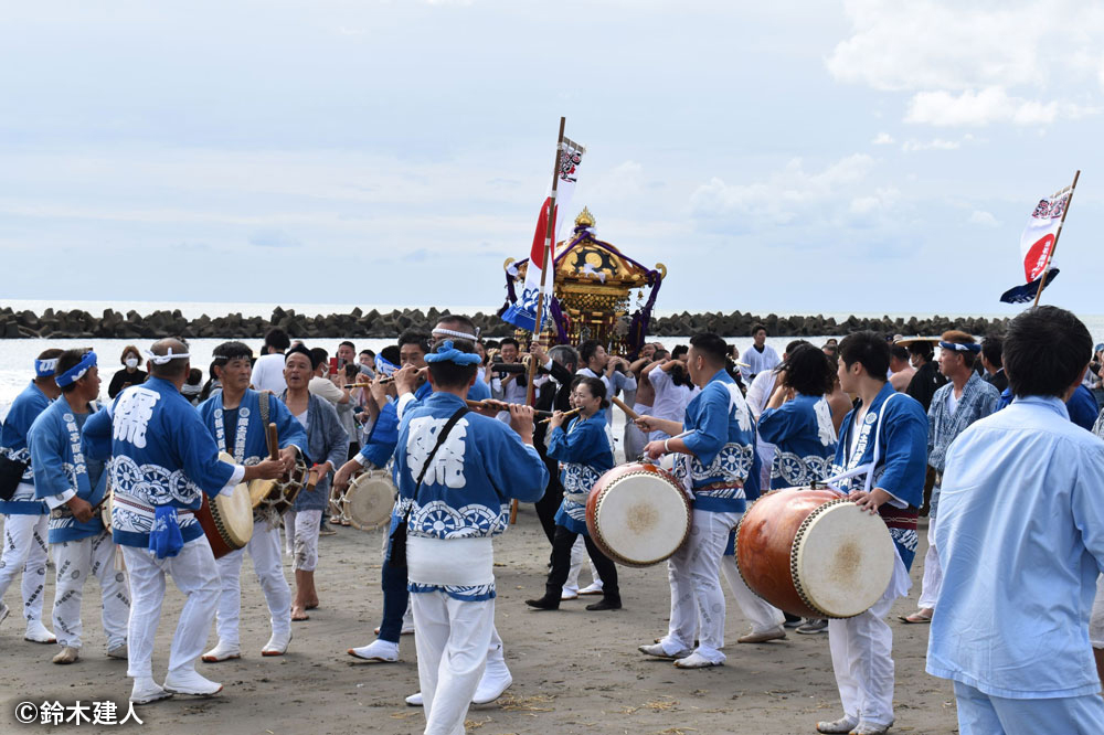 浜に入ると鳴り物(お囃子)が始まり、途中何回か揉みながら祭場まで進むと、祭場前で「アンバ」が披露されました。鳴り物(お囃子)は長岡・原宿が交互に担当することになっており、今年は長岡区が担当。大太鼓2基と篠笛5本の構成でした。また「アンバ」とは、差した神輿をぴたりと止めることをいい、これが長岡・原宿の舁夫たちの自慢であり見どころでもあるとのことでした。なお、従来、長岡・原宿区による鳴り物は、還御の最後の行程である諸徳持から神社にあがる間でだけ演奏されるものといわれ神幸の途中に入ることはありませんでしたが、今回は三川浜でも演奏が許されました。