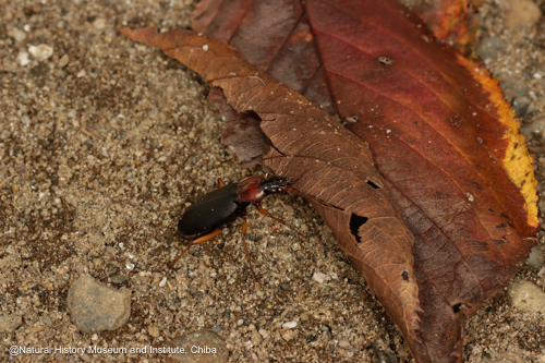 清和小学校にて。グラウンド脇を素早く歩いていた。「ゴミムシ」という名前だが、とても綺麗な昆虫である。写真の個体は「セアカ」の名前のとおり前胸背板が赤いが、黒くなる個体もいる。