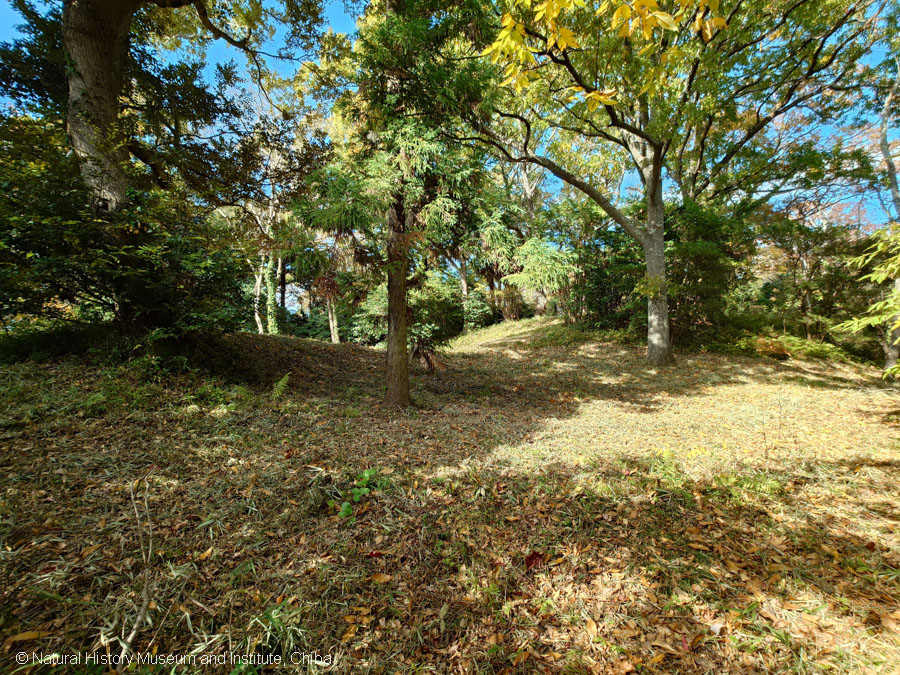 写真1 道祖神裏古墳。左が前方部、右が後方部。経年により墳丘盛土が流出しているようで、肩が落ちている。