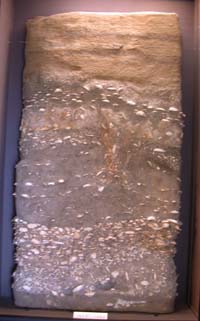 千葉県香取郡下総町猿山の貝層露頭を復元したもので、古東京湾時代(80万年〜15万年位前)に栄えた貝類の化石や海底に生息した生物の生痕を見ることができます。