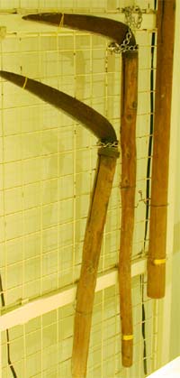 水田の漏水を防ぐために、古い畦(あぜ)を新たに補修し直すのに、くろひき鎌で壁部分を切り落とすのに使います。千葉県佐原市三島で使用されていたものです。