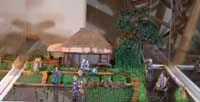 田植えの風景です。 手前の田では田植えをしていて、奥の田では苗取りをしています。右端のエンマでは水車(みずぐるま)で水汲みをしました。サッパ舟に牛とハローを載せて漕いでいきます。エンマの脇のダシ場で、釜を洗っているようです。