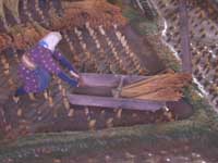 刈り取った稲を田舟(タブネ)に乗せて、オダまで運んでいます。土地改良前までは、