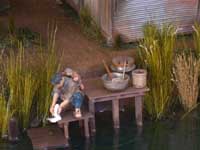 家の脇のダシ場でおかあさんが赤ちゃんを背負いながら、洗濯を