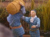 サッパ舟の上で、俵を受取ろうとしている男の人の顔です。千葉県佐原市