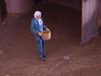 土摺臼で挽いた米と殻を唐箕まで運んでいます。