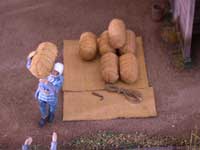 俵はコモを円筒状に縫い合わせて、左右から桟俵(さんだわら)