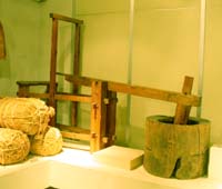 左側の木に人が乗って臼をつき、米を精白するのに使いました。千葉県佐原市西和田で使われていたものです。