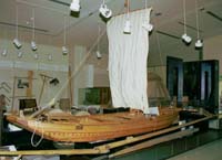 高瀬船の約1/5の大きさに復元した利根川高瀬船の模型です。「せいじ」と呼ばれる寝起きすることができる場所があることが特色の一つです。約600俵の米俵を運ぶことができました。荷物としては、米のほか酒や醤油・木材・ワラ製品や薪などが主なるものでした。