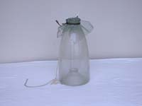 中に餌を入れ雑魚(ザッコ)をとるガラス製のズです。これは千葉県佐原市佐原で使用されていたものです。