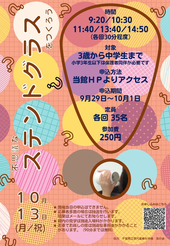 科学館わくわく教室 不思議なステンドグラスをつくろう(10月13日(月・祝)実施)の事前申込を、9月29日(月)から10月1日(水)までインターネットで行います。