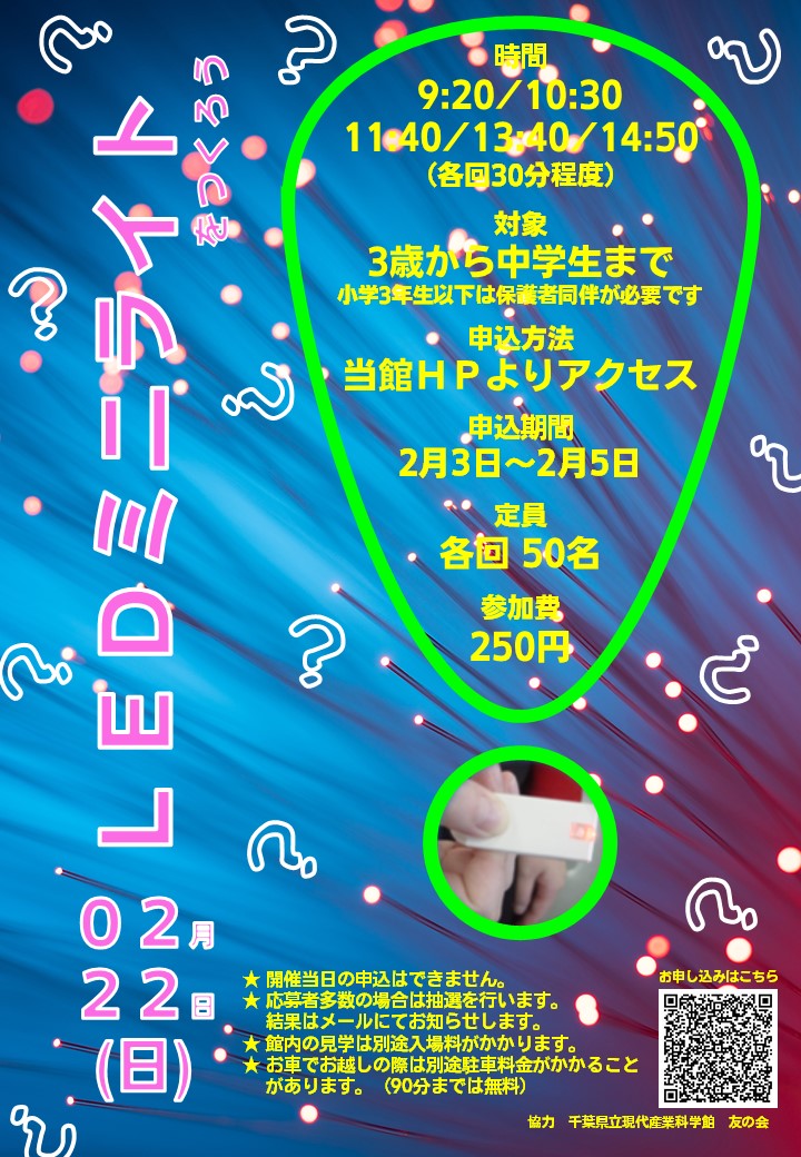 イベント等の事前予約方法 「イベントのご案内」コンテンツ内を検索 検索 イベント情報events 展覧会・イベント一覧 受付終了 イベント その他のイベント 令和7年度「第13回クラシックカー・スポーツカーin科学館」参加車両募集のお知らせ 日程 2026年03月01日(日) 申込み受付中 イベント その他のイベント 産業学習in科学館 ~素材から未来をつくる~(2月21日(土)開催)のお知らせ 日程 2026年02月21日(土) お申込みはこちら 受付終了 イベント その他のイベント 親子バイオ実験教室 カラーマジックケーキをつくろう 日程 2026年02月11日(水) 予告 イベント その他のイベント 千葉県立市川工業高等学校インテリア科卒展(卒業作品展) 日程 2026年02月07日(土)~2026年02月08日(日) 予告 イベント その他のイベント 1月31日(土)実施「カガクへのとびら」参加者募集のお知らせ 日程 2026年01月31日(土)10:30~11:30 受付終了 イベント その他のイベント 産業キャリアイメージ形成支援事業 「端材でキーホルダーをつくろう」 日程 2026年01月31日(土) 科学館わくわく教室 予告 イベント 科学館わくわく教室 科学館わくわく教室 「LEDミニライトをつくろう 」 日程 2026年02月22日(日) イベントカレンダー イベントカレンダー イベントの様子 令和5年度のイベントの様子 令和4年度のイベントの様子 令和3年度のイベントの様子 令和元年度のイベントの様子