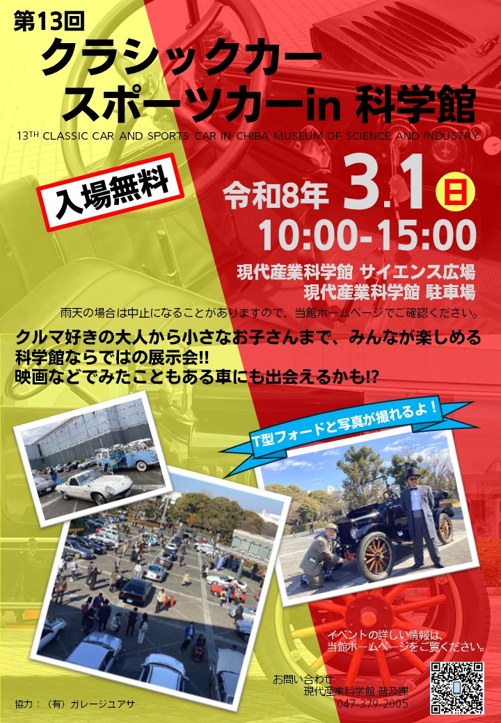 イベント等の事前予約方法 「イベントのご案内」コンテンツ内を検索 検索 イベント情報events 展覧会・イベント一覧 予告 イベント その他のイベント 土器ッと古代“宅配便”-勾玉をつくろう- 日程 2026年03月08日(日) 予告 イベント その他のイベント 「第13回クラシックカー・スポーツカーin科学館」の開催について 日程 2026年03月01日(日)10:00~15:00 受付終了 イベント その他のイベント 令和7年度「第13回クラシックカー・スポーツカーin科学館」参加車両募集のお知らせ 日程 2026年03月01日(日) 申込み受付中 イベント その他のイベント 産業学習in科学館 ~素材から未来をつくる~(2月21日(土)開催)のお知らせ 日程 2026年02月21日(土) お申込みはこちら 科学館わくわく教室 受付終了 イベント 科学館わくわく教室 科学館わくわく教室 「手作りカイロをつくろう 」 日程 2026年02月23日(月) 受付終了 イベント 科学館わくわく教室 科学館わくわく教室 「LEDミニライトをつくろう 」 日程 2026年02月22日(日) イベントカレンダー イベントカレンダー イベントの様子 令和5年度のイベントの様子 令和4年度のイベントの様子 令和3年度のイベントの様子 令和元年度のイベントの様子