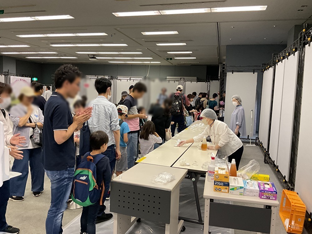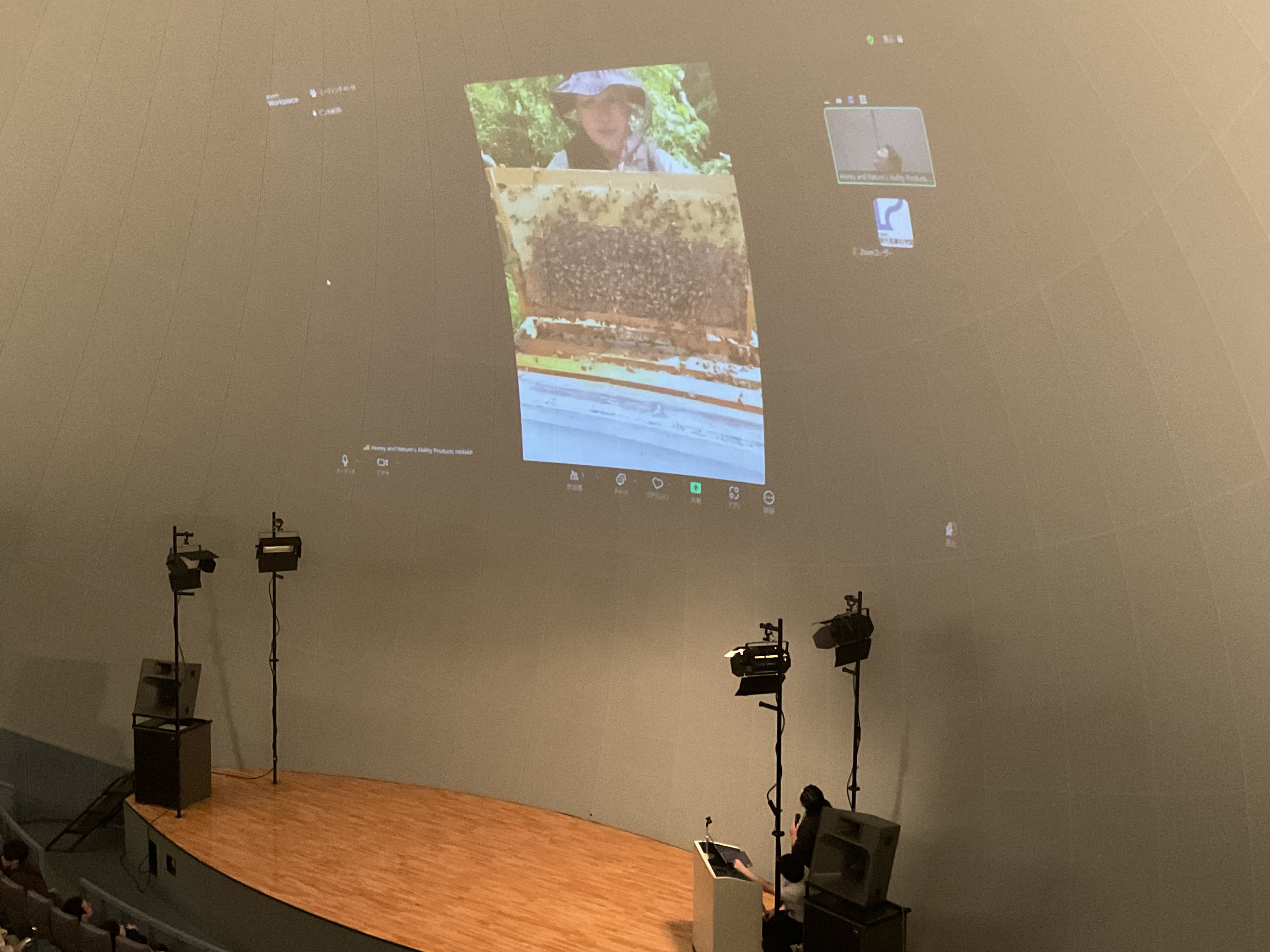 イベントでは、養蜂の仕事やミツバチの生態についてクイズを交えながらお話しいただいた後、養蜂場と現代産業科学館をオンラインでつないで、実際に巣箱やハチの様子をサイエンスドームの大画面を通してみることができました。展示会では、養蜂道具や巣箱等を展示し、実際に使っている道具や本物のハチに関心をもって見ている参加者が多くいました。また、2種類のハチミツの味を比べる試食会も大盛況でした。今回のイベントを通して、多くの方に産業学習に興味をもってもらうことができました。